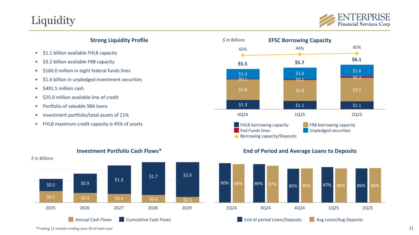 20 Investment Portfolio Breakout AFS & HTM Securities Obligations of U.S. Government- sponsored enterprises 7% Obligations of states and political subdivisions 43% Agency mortgage- backed securities 42% Corporate debt securities 4% U.S. Treasury bills 4% TOTAL $3.3 billion • Effective duration of 5.1 years balances the short 3-year duration of the loan portfolio • Cash flows next 12 months of approximately $547.5 million • 3.86% tax-equivalent yield • Municipal bond portfolio rated A or better • Laddered maturity and repayment structure for consistent cash flows Overview Total AFS (Fair Value) Total HTM (Fair Value) AFS Securities (Net Unrealized) HTM Securities (Net Unrealized) 2Q24 3Q24 4Q24 1Q25 2Q25 $— $800 $1,600 $2,400 $(200) $(100) $— $100 $ In Millions $67.2 $241.4 $359.4 $314.9 $348.6 5.43% 4.97% 5.10% 5.20% 5.30% Principal Cost Yield (TEQ) 2Q24 3Q24 4Q24 1Q25 2Q25 Investment Purchase Yield $ In Millions Investment Portfolio