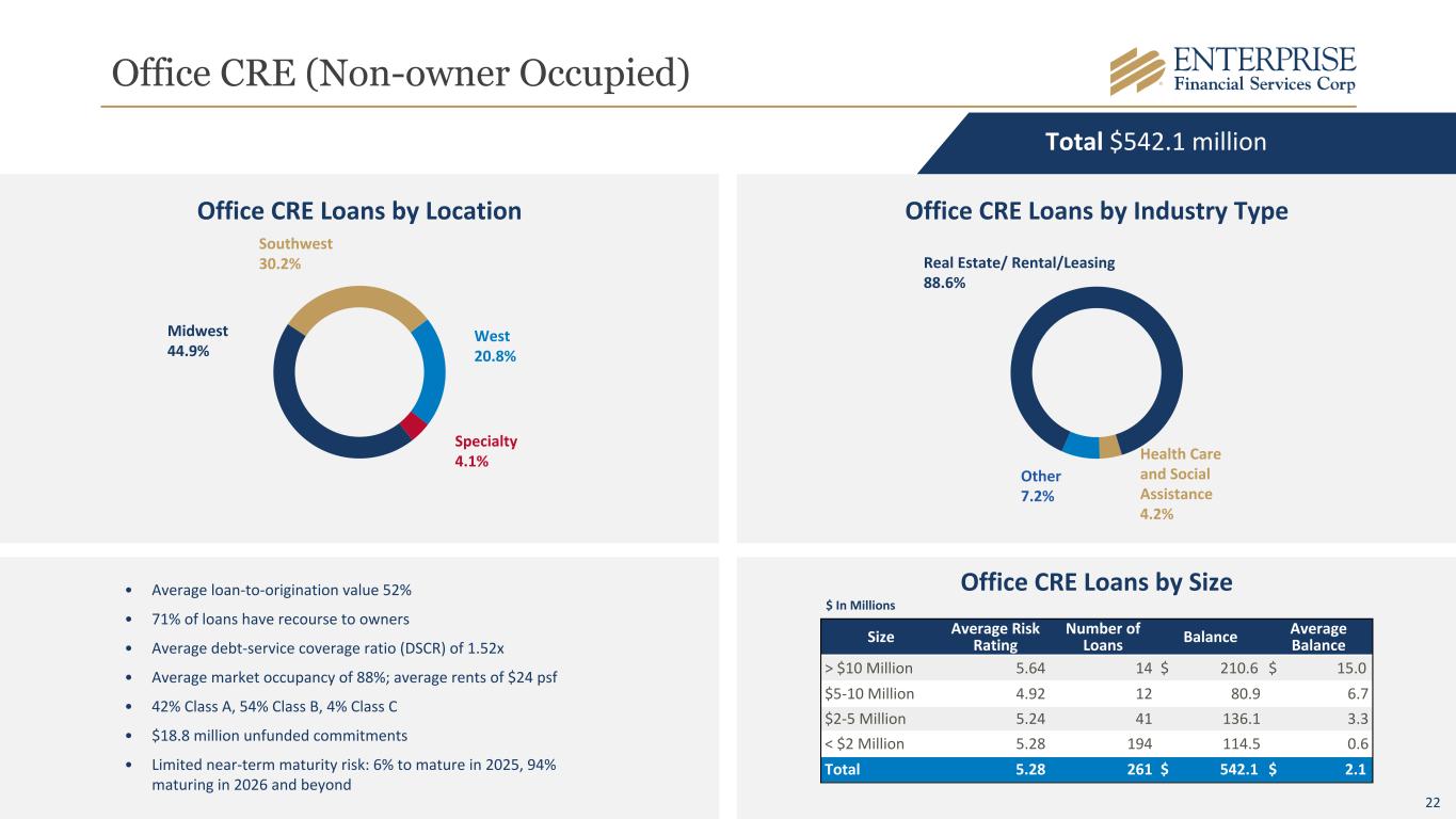 21 EFSC Borrowing Capacity $5.5 $5.7 $6.1 $1.3 $1.1 $1.1 $2.8 $2.9 $3.2 $0.1 $0.1 $0.2 $1.3 $1.6 $1.6 42% 44% 45% FHLB borrowing capacity FRB borrowing capacity Fed Funds lines Unpledged securities Borrowing capacity/Deposits 4Q24 1Q25 2Q25 $ In Billions End of Period and Average Loans to Deposits 90% 89% 85% 87% 86%89% 87% 86% 86% 86% End of period Loans/Deposits Avg Loans/Avg Deposits 2Q24 3Q24 4Q24 1Q25 2Q25 • $1.1 billion available FHLB capacity • $3.2 billion available FRB capacity • $160.0 million in eight federal funds lines • $1.6 billion in unpledged investment securities • $491.5 million cash • $25.0 million available line of credit • Portfolio of saleable SBA loans • Investment portfolio/total assets of 21% • FHLB maximum credit capacity is 45% of assets $0.5 $0.4 $0.4 $0.4 $0.3 $0.5 $0.9 $1.3 $1.7 $2.0 Annual Cash Flows Cumulative Cash Flows 2025 2026 2027 2028 2029 Investment Portfolio Cash Flows* $ In Billions Strong Liquidity Profile *Trailing 12 months ending June 30 of each year Liquidity