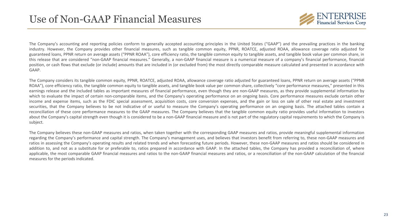 23 Use of Non-GAAP Financial Measures The Company’s accounting and reporting policies conform to generally accepted accounting principles in the United States (“GAAP”) and the prevailing practices in the banking industry. However, the Company provides other financial measures, such as tangible common equity, PPNR, ROATCE, adjusted ROAA, allowance coverage ratio adjusted for guaranteed loans, PPNR return on average assets (“PPNR ROAA”), core efficiency ratio, the tangible common equity to tangible assets, and tangible book value per common share, in this release that are considered “non-GAAP financial measures.” Generally, a non-GAAP financial measure is a numerical measure of a company’s financial performance, financial position, or cash flows that exclude (or include) amounts that are included in (or excluded from) the most directly comparable measure calculated and presented in accordance with GAAP. The Company considers its tangible common equity, PPNR, ROATCE, adjusted ROAA, allowance coverage ratio adjusted for guaranteed loans, PPNR return on average assets (“PPNR ROAA”), core efficiency ratio, the tangible common equity to tangible assets, and tangible book value per common share, collectively “core performance measures,” presented in this earnings release and the included tables as important measures of financial performance, even though they are non-GAAP measures, as they provide supplemental information by which to evaluate the impact of certain non-comparable items, and the Company’s operating performance on an ongoing basis. Core performance measures exclude certain other income and expense items, such as the FDIC special assessment, acquisition costs, core conversion expenses, and the gain or loss on sale of other real estate and investment securities, that the Company believes to be not indicative of or useful to measure the Company’s operating performance on an ongoing basis. The attached tables contain a reconciliation of these core performance measures to the GAAP measures. The Company believes that the tangible common equity ratio provides useful information to investors about the Company’s capital strength even though it is considered to be a non-GAAP financial measure and is not part of the regulatory capital requirements to which the Company is subject. The Company believes these non-GAAP measures and ratios, when taken together with the corresponding GAAP measures and ratios, provide meaningful supplemental information regarding the Company’s performance and capital strength. The Company’s management uses, and believes that investors benefit from referring to, these non-GAAP measures and ratios in assessing the Company’s operating results and related trends and when forecasting future periods. However, these non-GAAP measures and ratios should be considered in addition to, and not as a substitute for or preferable to, ratios prepared in accordance with GAAP. In the attached tables, the Company has provided a reconciliation of, where applicable, the most comparable GAAP financial measures and ratios to the non-GAAP financial measures and ratios, or a reconciliation of the non-GAAP calculation of the financial measures for the periods indicated.