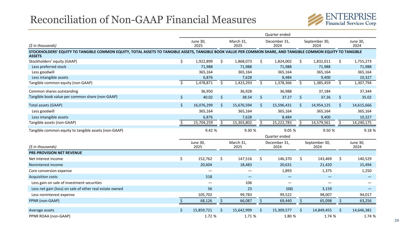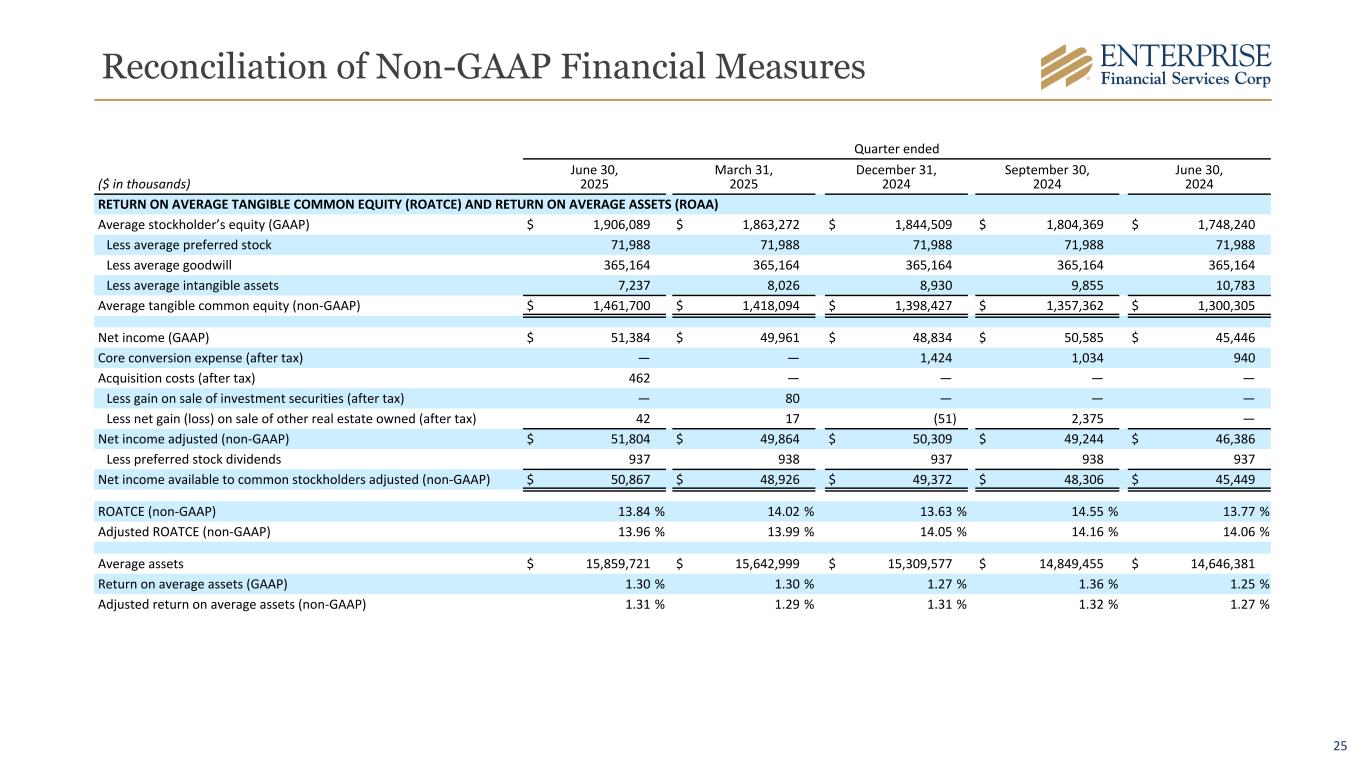 24 Reconciliation of Non-GAAP Financial Measures Quarter ended ($ in thousands) June 30, 2025 March 31, 2025 December 31, 2024 September 30, 2024 June 30, 2024 STOCKHOLDERS’ EQUITY TO TANGIBLE COMMON EQUITY, TOTAL ASSETS TO TANGIBLE ASSETS, TANGIBLE BOOK VALUE PER COMMON SHARE, AND TANGIBLE COMMON EQUITY TO TANGIBLE ASSETS Stockholders’ equity (GAAP) $ 1,922,899 $ 1,868,073 $ 1,824,002 $ 1,832,011 $ 1,755,273 Less preferred stock 71,988 71,988 71,988 71,988 71,988 Less goodwill 365,164 365,164 365,164 365,164 365,164 Less intangible assets 6,876 7,628 8,484 9,400 10,327 Tangible common equity (non-GAAP) $ 1,478,871 $ 1,423,293 $ 1,378,366 $ 1,385,459 $ 1,307,794 Common shares outstanding 36,950 36,928 36,988 37,184 37,344 Tangible book value per common share (non-GAAP) $ 40.02 $ 38.54 $ 37.27 $ 37.26 $ 35.02 Total assets (GAAP) $ 16,076,299 $ 15,676,594 $ 15,596,431 $ 14,954,125 $ 14,615,666 Less goodwill 365,164 365,164 365,164 365,164 365,164 Less intangible assets 6,876 7,628 8,484 9,400 10,327 Tangible assets (non-GAAP) $ 15,704,259 $ 15,303,802 $ 15,222,783 $ 14,579,561 $ 14,240,175 Tangible common equity to tangible assets (non-GAAP) 9.42 % 9.30 % 9.05 % 9.50 % 9.18 % Quarter ended ($ in thousands) June 30, 2025 March 31, 2025 December 31, 2024 September 30, 2024 June 30, 2024 PRE-PROVISION NET REVENUE Net interest income $ 152,762 $ 147,516 $ 146,370 $ 143,469 $ 140,529 Noninterest income 20,604 18,483 20,631 21,420 15,494 Core conversion expense — — 1,893 1,375 1,250 Acquisition costs 518 — — — — Less gain on sale of investment securities — 106 — — — Less net gain (loss) on sale of other real estate owned 56 23 (68) 3,159 — Less noninterest expense 105,702 99,783 99,522 98,007 94,017 PPNR (non-GAAP) $ 68,126 $ 66,087 $ 69,440 $ 65,098 $ 63,256 Average assets $ 15,859,721 $ 15,642,999 $ 15,309,577 $ 14,849,455 $ 14,646,381 PPNR ROAA (non-GAAP) 1.72 % 1.71 % 1.80 % 1.74 % 1.74 %