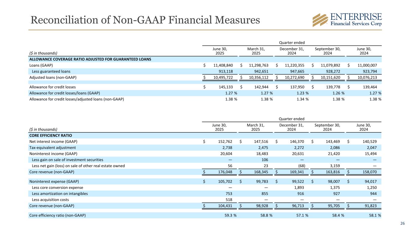 25 Reconciliation of Non-GAAP Financial Measures Quarter ended ($ in thousands) June 30, 2025 March 31, 2025 December 31, 2024 September 30, 2024 June 30, 2024 RETURN ON AVERAGE TANGIBLE COMMON EQUITY (ROATCE) AND RETURN ON AVERAGE ASSETS (ROAA) Average stockholder’s equity (GAAP) $ 1,906,089 $ 1,863,272 $ 1,844,509 $ 1,804,369 $ 1,748,240 Less average preferred stock 71,988 71,988 71,988 71,988 71,988 Less average goodwill 365,164 365,164 365,164 365,164 365,164 Less average intangible assets 7,237 8,026 8,930 9,855 10,783 Average tangible common equity (non-GAAP) $ 1,461,700 $ 1,418,094 $ 1,398,427 $ 1,357,362 $ 1,300,305 Net income (GAAP) $ 51,384 $ 49,961 $ 48,834 $ 50,585 $ 45,446 Core conversion expense (after tax) — — 1,424 1,034 940 Acquisition costs (after tax) 462 — — — — Less gain on sale of investment securities (after tax) — 80 — — — Less net gain (loss) on sale of other real estate owned (after tax) 42 17 (51) 2,375 — Net income adjusted (non-GAAP) $ 51,804 $ 49,864 $ 50,309 $ 49,244 $ 46,386 Less preferred stock dividends 937 938 937 938 937 Net income available to common stockholders adjusted (non-GAAP) $ 50,867 $ 48,926 $ 49,372 $ 48,306 $ 45,449 ROATCE (non-GAAP) 13.84 % 14.02 % 13.63 % 14.55 % 13.77 % Adjusted ROATCE (non-GAAP) 13.96 % 13.99 % 14.05 % 14.16 % 14.06 % Average assets $ 15,859,721 $ 15,642,999 $ 15,309,577 $ 14,849,455 $ 14,646,381 Return on average assets (GAAP) 1.30 % 1.30 % 1.27 % 1.36 % 1.25 % Adjusted return on average assets (non-GAAP) 1.31 % 1.29 % 1.31 % 1.32 % 1.27 %