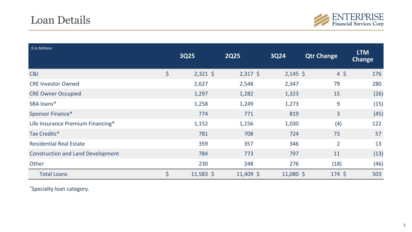 4 Financial Highlights, continued - 3Q25* *Comparisons noted below are to the linked quarter unless otherwise noted. **A Non-GAAP Measure, Refer to Appendix for Reconciliation. Loans & Deposits • Loans $11.6 billion, up $174.3 million • Loan/Deposit Ratio 85.4% • Sold $22.2 million of SBA loans, gain of $1.1 million • Deposits $13.6 billion, up $250.6 million or $240.5 million excluding brokered CDs • Noninterest-bearing Deposits/Total Deposits 32% Asset Quality • Nonperforming Loans/Loans 1.10% • Nonperforming Assets/Assets 0.83% • Allowance Coverage Ratio 1.29%; 1.40% adjusted for guaranteed loans** • Net Charge-Offs $4.1 million