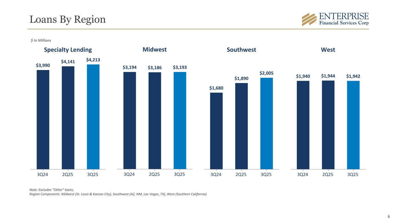 5 Loan Details 3Q25 2Q25 3Q24 Qtr Change LTM Change C&I $ 2,321 $ 2,317 $ 2,145 $ 4 $ 176 CRE Investor Owned 2,627 2,548 2,347 79 280 CRE Owner Occupied 1,297 1,282 1,323 15 (26) SBA loans* 1,258 1,249 1,273 9 (15) Sponsor Finance* 774 771 819 3 (45) Life Insurance Premium Financing* 1,152 1,156 1,030 (4) 122 Tax Credits* 781 708 724 73 57 Residential Real Estate 359 357 346 2 13 Construction and Land Development 784 773 797 11 (13) Other 230 248 276 (18) (46) Total Loans $ 11,583 $ 11,409 $ 11,080 $ 174 $ 503 *Specialty loan category. $ In Millions
