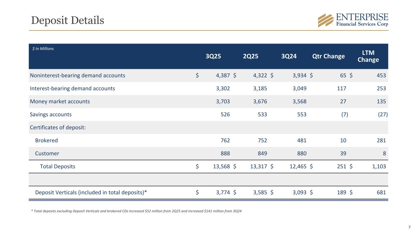 6 Loans By Region Specialty Lending $3,990 $4,141 $4,213 3Q24 2Q25 3Q25 $ In Millions Midwest $3,194 $3,186 $3,193 3Q24 2Q25 3Q25 Southwest $1,680 $1,890 $2,005 3Q24 2Q25 3Q25 Note: Excludes “Other” loans; Region Components: Midwest (St. Louis & Kansas City), Southwest (AZ, NM, Las Vegas, TX), West (Southern California) West $1,940 $1,944 $1,942 3Q24 2Q25 3Q25