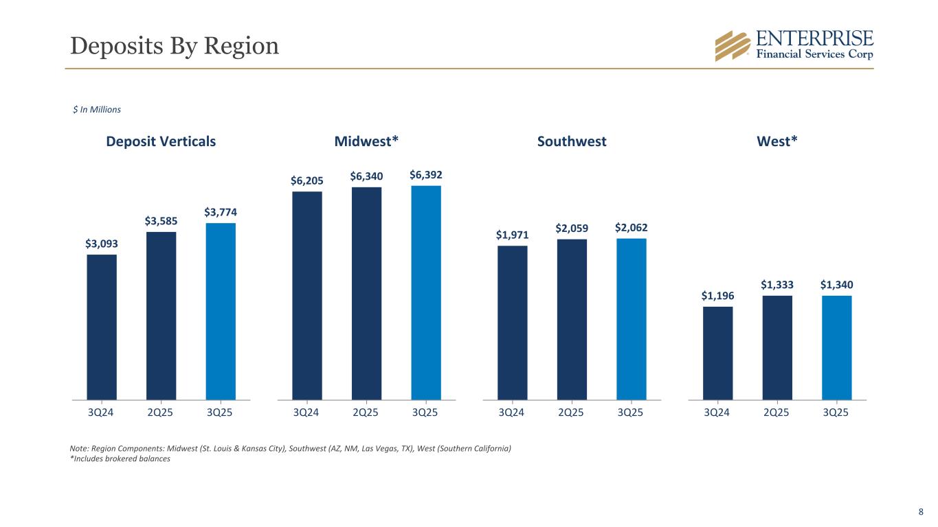 7 Deposit Details 3Q25 2Q25 3Q24 Qtr Change LTM Change Noninterest-bearing demand accounts $ 4,387 $ 4,322 $ 3,934 $ 65 $ 453 Interest-bearing demand accounts 3,302 3,185 3,049 117 253 Money market accounts 3,703 3,676 3,568 27 135 Savings accounts 526 533 553 (7) (27) Certificates of deposit: Brokered 762 752 481 10 281 Customer 888 849 880 39 8 Total Deposits $ 13,568 $ 13,317 $ 12,465 $ 251 $ 1,103 Deposit Verticals (included in total deposits)* $ 3,774 $ 3,585 $ 3,093 $ 189 $ 681 $ In Millions * Total deposits excluding Deposit Verticals and brokered CDs increased $52 million from 2Q25 and increased $141 million from 3Q24