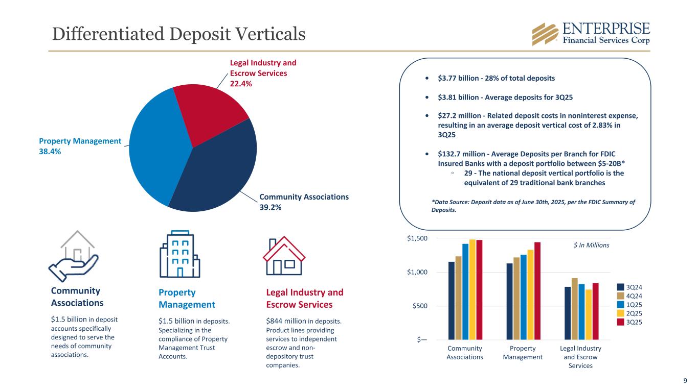 8 Deposits By Region Deposit Verticals $3,093 $3,585 $3,774 3Q24 2Q25 3Q25 $ In Millions Note: Region Components: Midwest (St. Louis & Kansas City), Southwest (AZ, NM, Las Vegas, TX), West (Southern California) *Includes brokered balances Midwest* $6,205 $6,340 $6,392 3Q24 2Q25 3Q25 West* $1,196 $1,333 $1,340 3Q24 2Q25 3Q25 Southwest $1,971 $2,059 $2,062 3Q24 2Q25 3Q25