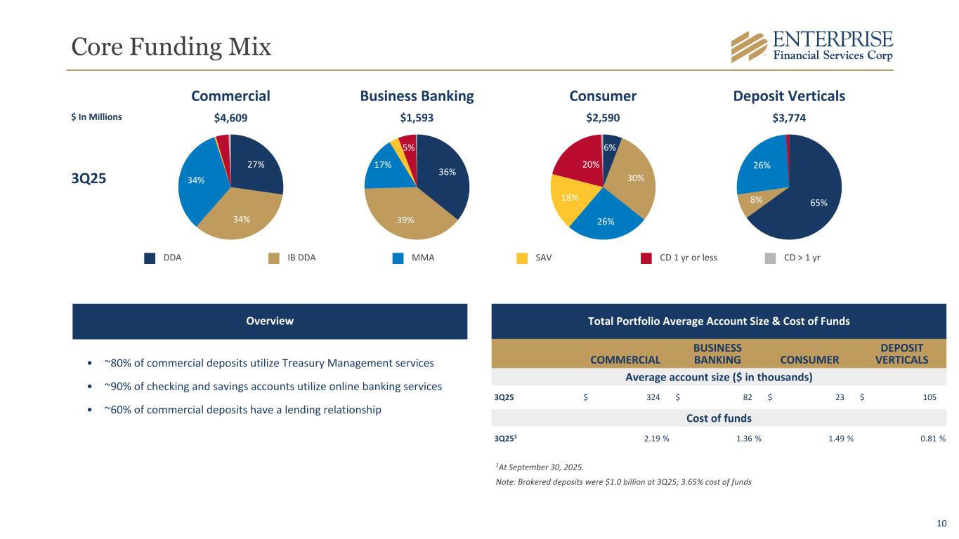 9 Differentiated Deposit Verticals Community Associations 39.2% Property Management 38.4% Legal Industry and Escrow Services 22.4% Community Associations $1.5 billion in deposit accounts specifically designed to serve the needs of community associations. Property Management $1.5 billion in deposits. Specializing in the compliance of Property Management Trust Accounts. Legal Industry and Escrow Services $844 million in deposits. Product lines providing services to independent escrow and non- depository trust companies. • $3.77 billion - 28% of total deposits • $3.81 billion - Average deposits for 3Q25 • $27.2 million - Related deposit costs in noninterest expense, resulting in an average deposit vertical cost of 2.83% in 3Q25 • $132.7 million - Average Deposits per Branch for FDIC Insured Banks with a deposit portfolio between $5-20B* ◦ 29 - The national deposit vertical portfolio is the equivalent of 29 traditional bank branches *Data Source: Deposit data as of June 30th, 2025, per the FDIC Summary of Deposits. 3Q24 4Q24 1Q25 2Q25 3Q25 Community Associations Property Management Legal Industry and Escrow Services $— $500 $1,000 $1,500 $ In Millions