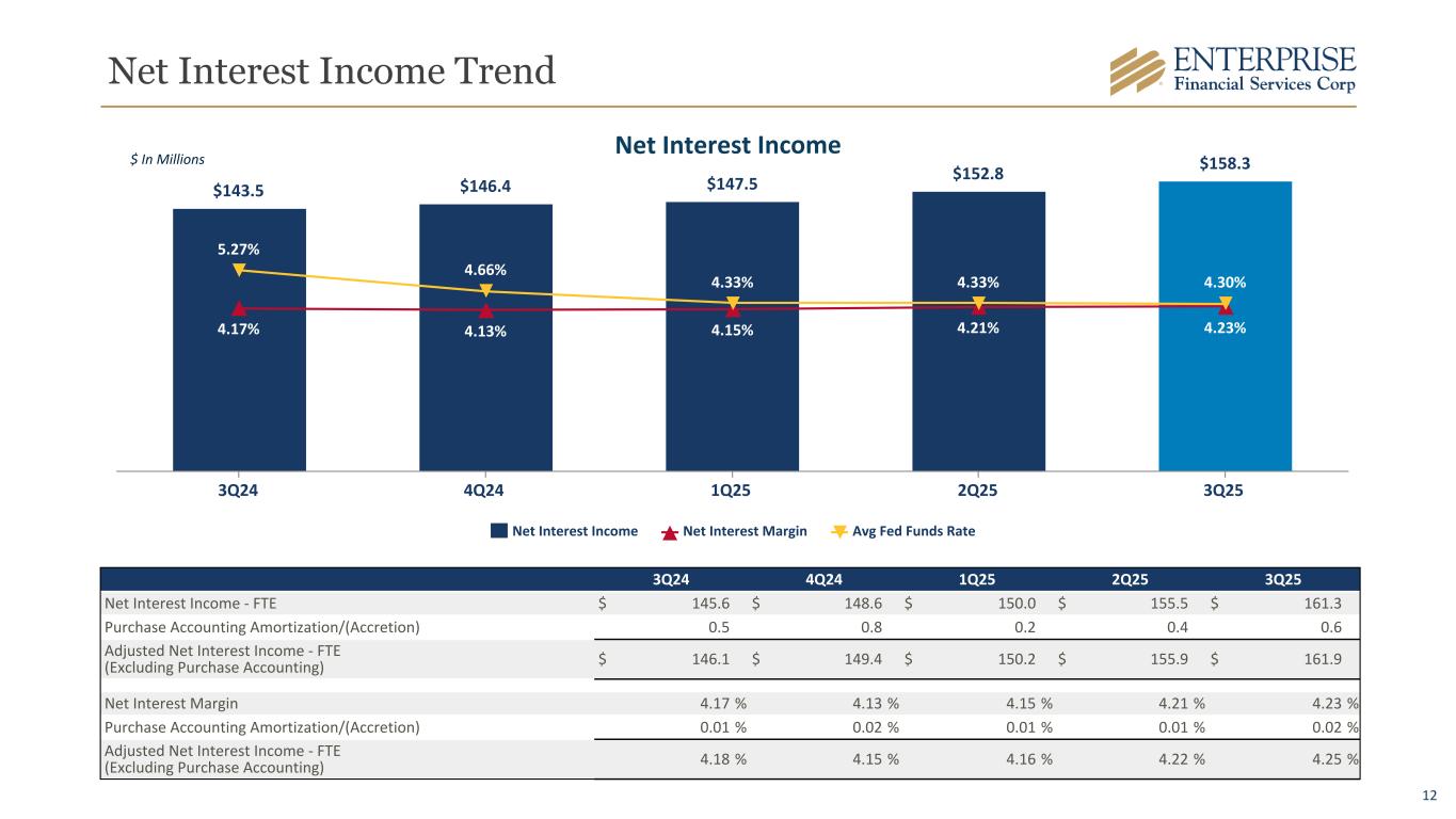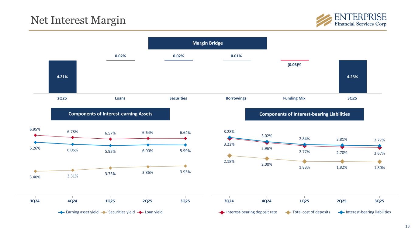 12 $143.5 $146.4 $147.5 $152.8 $158.3 4.17% 4.13% 4.15% 4.21% 4.23% 5.27% 4.66% 4.33% 4.33% 4.30% Net Interest Income Net Interest Margin Avg Fed Funds Rate 3Q24 4Q24 1Q25 2Q25 3Q25 Net Interest Income Trend $ In Millions Net Interest Income 3Q24 4Q24 1Q25 2Q25 3Q25 Net Interest Income - FTE $ 145.6 $ 148.6 $ 150.0 $ 155.5 $ 161.3 Purchase Accounting Amortization/(Accretion) 0.5 0.8 0.2 0.4 0.6 Adjusted Net Interest Income - FTE (Excluding Purchase Accounting) $ 146.1 $ 149.4 $ 150.2 $ 155.9 $ 161.9 Net Interest Margin 4.17 % 4.13 % 4.15 % 4.21 % 4.23 % Purchase Accounting Amortization/(Accretion) 0.01 % 0.02 % 0.01 % 0.01 % 0.02 % Adjusted Net Interest Income - FTE (Excluding Purchase Accounting) 4.18 % 4.15 % 4.16 % 4.22 % 4.25 %