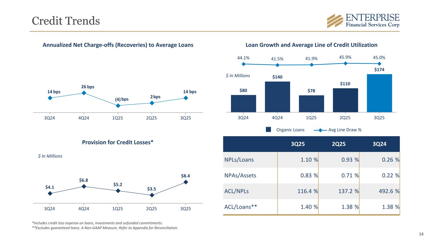 13 Net Interest Margin 6.95% 6.73% 6.57% 6.64% 6.64% 3.40% 3.51% 3.75% 3.86% 3.93% 6.26% 6.05% 5.93% 6.00% 5.99% Earning asset yield Securities yield Loan yield 3Q24 4Q24 1Q25 2Q25 3Q25 3.22% 2.96% 2.77% 2.70% 2.67% 2.18% 2.00% 1.83% 1.82% 1.80% 3.28% 3.02% 2.84% 2.81% 2.77% Interest-bearing deposit rate Total cost of deposits Interest-bearing liabilities 3Q24 4Q24 1Q25 2Q25 3Q25 Components of Interest-bearing LiabilitiesComponents of Interest-earning Assets 4.21% 0.02% 0.02% 0.01% (0.03)% 4.23% 2Q25 Loans Securities Borrowings Funding Mix 3Q25 Margin Bridge