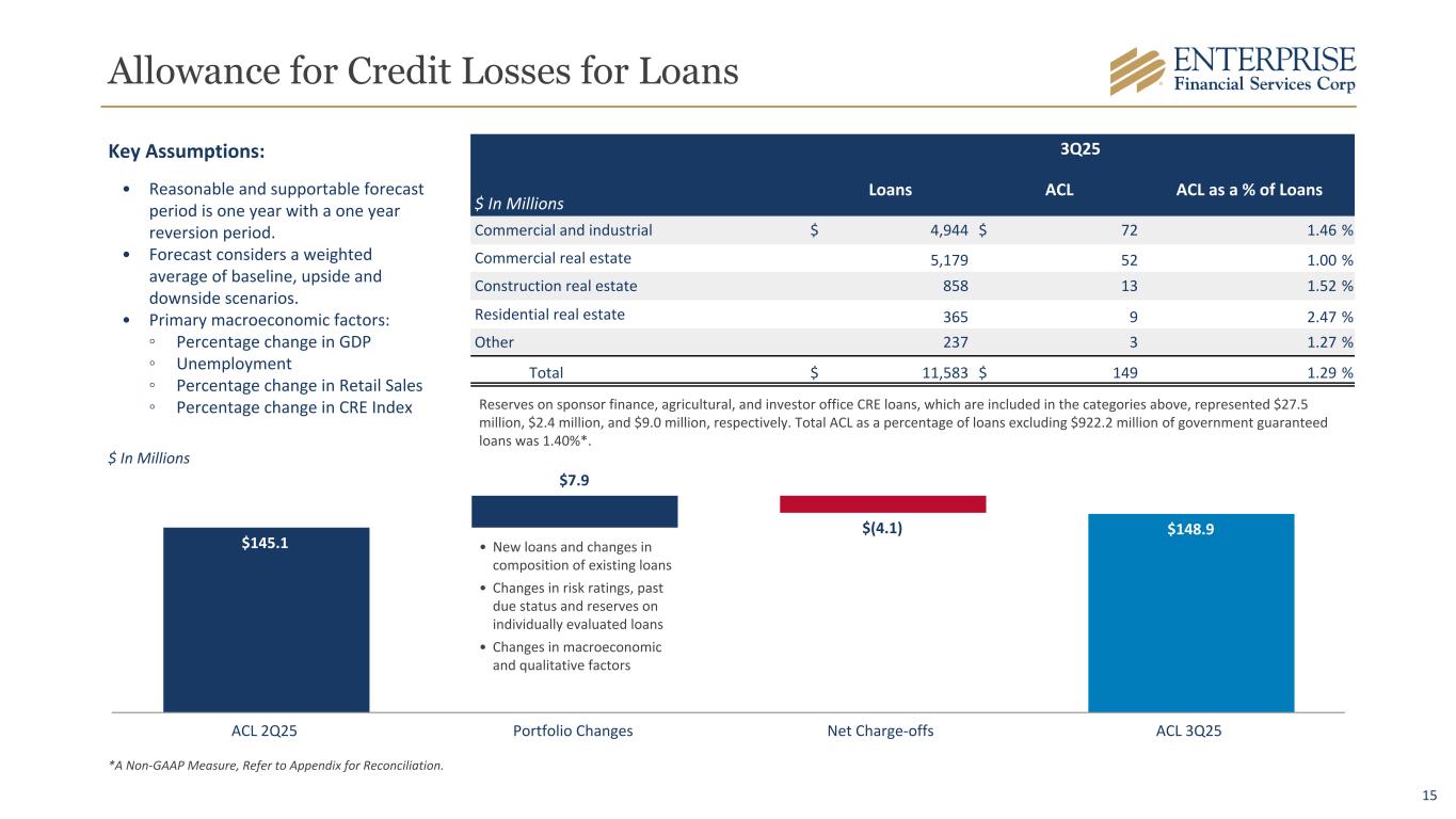 14 14 26 (4) 2 14 3Q24 4Q24 1Q25 2Q25 3Q25 $80 $140 $78 $110 $174 44.1% 41.5% 41.9% 45.9% 45.0% Organic Loans Avg Line Draw % 3Q24 4Q24 1Q25 2Q25 3Q25 3Q25 2Q25 3Q24 NPLs/Loans 1.10 % 0.93 % 0.26 % NPAs/Assets 0.83 % 0.71 % 0.22 % ACL/NPLs 116.4 % 137.2 % 492.6 % ACL/Loans** 1.40 % 1.38 % 1.38 % Annualized Net Charge-offs (Recoveries) to Average Loans Provision for Credit Losses* $4.1 $6.8 $5.2 $3.5 $8.4 3Q24 4Q24 1Q25 2Q25 3Q25 $ In Millions bps bps bpsbps bps $ In Millions Loan Growth and Average Line of Credit Utilization *Includes credit loss expense on loans, investments and unfunded commitments. **Excludes guaranteed loans. A Non-GAAP Measure, Refer to Appendix for Reconciliation. Credit Trends