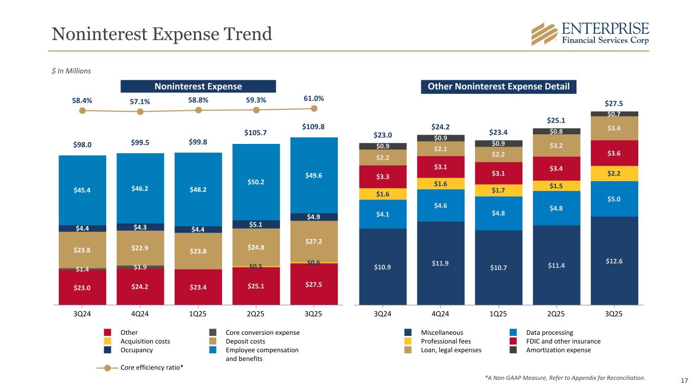 16 Noninterest Income Trend $21.4 $20.6 $18.5 $20.6 $46.6 $8.3 $4.7 $6.4 $8.5 $6.8 $30.1 $3.3 $6.0 $2.6 $2.2 $(0.3) $4.6 $4.7 $4.4 $4.9 $4.9 $2.6 $2.5 $2.4 $2.4 $2.5 $2.6 $2.7 $2.7 $2.6 $2.6 13.0% 12.4% 11.1% 11.9% 22.8% Other Recaptured Tax Credit Insurance Proceeds* Tax Credit Income (Loss) Deposit Services Charge Card Services Wealth Management Noninterest income/Total income 3Q24 4Q24 1Q25 2Q25 3Q25 $8.3 $4.7 $6.4 $8.5 $6.8 $1.7 $1.7 $1.7 $2.1 $1.8 $0.5 $0.5 $0.5 $0.5 $0.6 $1.1 $0.9 $0.9 $2.6 $2.1$1.0 $0.1 $0.3 $1.2 $0.3 $0.7 $1.4 $0.3$0.6 $0.3 $0.7 $0.5 $0.6 $3.2 $0.1 $1.9 $1.2 $1.1 Miscellaneous Servicing Fees BOLI Swap Fees CDE Private Equity Fund Distribution Gain on Sale of OREO Gain on SBA Loan Sales 3Q24 4Q24 1Q25 2Q25 3Q25 $ In Millions Noninterest Income Other Noninterest Income Detail *Represents anticipated recapture of $24.1 million solar tax credit and approximately $6.0 million of estimated tax liability related to anticipated proceeds from pending insurance claim related to the recapture event.