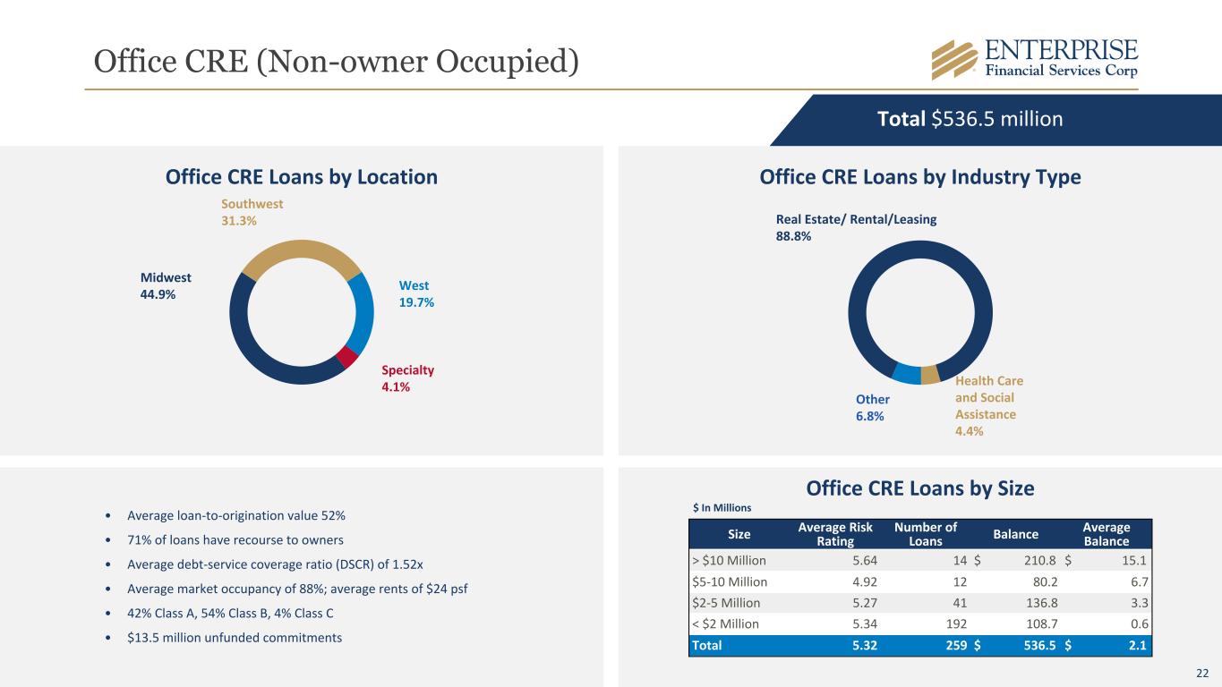 21 EFSC Borrowing Capacity $5.7 $6.1 $6.3 $1.1 $1.1 $1.0 $2.9 $3.2 $3.3 $0.1 $0.2 $0.2 $1.6 $1.6 $1.8 44% 45% 47% FHLB borrowing capacity FRB borrowing capacity Fed Funds lines Unpledged securities Borrowing capacity/Deposits 1Q25 2Q25 3Q25 $ In Billions End of Period and Average Loans to Deposits 89% 85% 87% 86% 85%87% 86% 86% 86% 84% End of period Loans/Deposits Avg Loans/Avg Deposits 3Q24 4Q24 1Q25 2Q25 3Q25 • $1.0 billion available FHLB capacity • $3.3 billion available FRB capacity • $160.0 million in eight federal funds lines • $1.8 billion in unpledged investment securities • $472.0 million cash • $25.0 million available line of credit • Portfolio of saleable SBA loans • Investment portfolio/total assets of 21% • FHLB maximum credit capacity is 45% of assets $0.6 $0.5 $0.4 $0.4 $0.3 $0.6 $1.1 $1.5 $1.9 $2.2 Annual Cash Flows Cumulative Cash Flows 2025 2026 2027 2028 2029 Investment Portfolio Cash Flows* $ In Billions Strong Liquidity Profile *Trailing 12 months ending September 30 of each year Liquidity