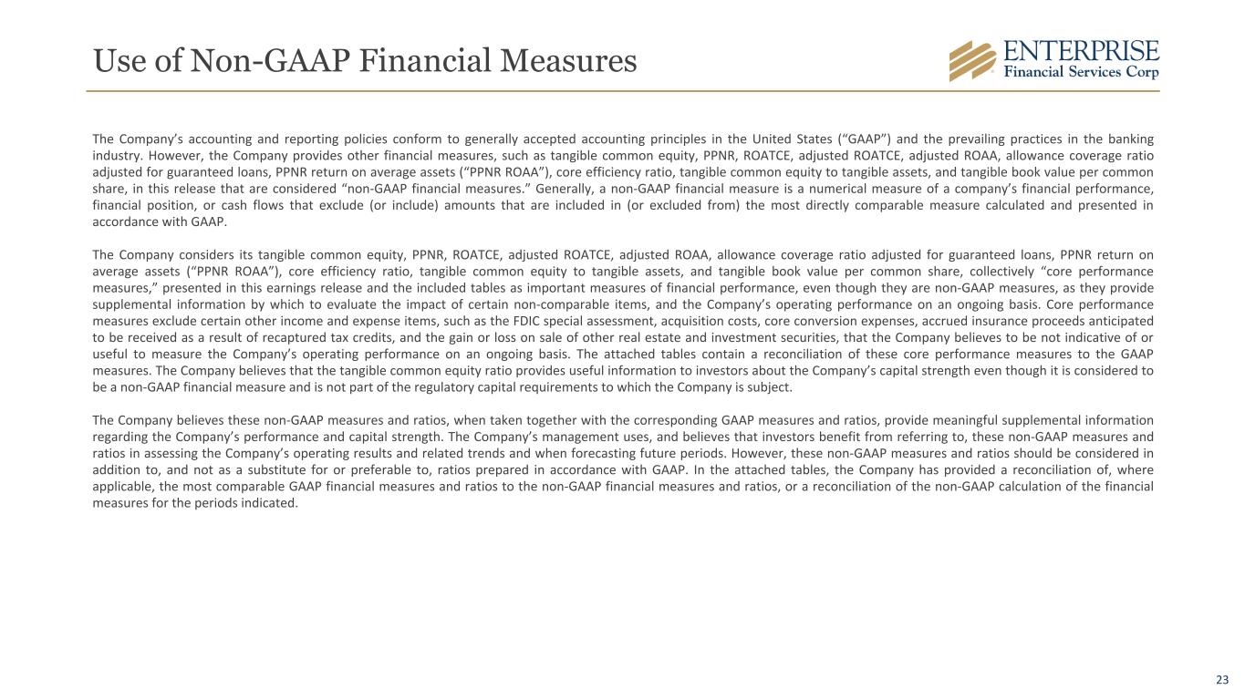 23 Use of Non-GAAP Financial Measures The Company’s accounting and reporting policies conform to generally accepted accounting principles in the United States (“GAAP”) and the prevailing practices in the banking industry. However, the Company provides other financial measures, such as tangible common equity, PPNR, ROATCE, adjusted ROATCE, adjusted ROAA, allowance coverage ratio adjusted for guaranteed loans, PPNR return on average assets (“PPNR ROAA”), core efficiency ratio, tangible common equity to tangible assets, and tangible book value per common share, in this release that are considered “non-GAAP financial measures.” Generally, a non-GAAP financial measure is a numerical measure of a company’s financial performance, financial position, or cash flows that exclude (or include) amounts that are included in (or excluded from) the most directly comparable measure calculated and presented in accordance with GAAP. The Company considers its tangible common equity, PPNR, ROATCE, adjusted ROATCE, adjusted ROAA, allowance coverage ratio adjusted for guaranteed loans, PPNR return on average assets (“PPNR ROAA”), core efficiency ratio, tangible common equity to tangible assets, and tangible book value per common share, collectively “core performance measures,” presented in this earnings release and the included tables as important measures of financial performance, even though they are non-GAAP measures, as they provide supplemental information by which to evaluate the impact of certain non-comparable items, and the Company’s operating performance on an ongoing basis. Core performance measures exclude certain other income and expense items, such as the FDIC special assessment, acquisition costs, core conversion expenses, accrued insurance proceeds anticipated to be received as a result of recaptured tax credits, and the gain or loss on sale of other real estate and investment securities, that the Company believes to be not indicative of or useful to measure the Company’s operating performance on an ongoing basis. The attached tables contain a reconciliation of these core performance measures to the GAAP measures. The Company believes that the tangible common equity ratio provides useful information to investors about the Company’s capital strength even though it is considered to be a non-GAAP financial measure and is not part of the regulatory capital requirements to which the Company is subject. The Company believes these non-GAAP measures and ratios, when taken together with the corresponding GAAP measures and ratios, provide meaningful supplemental information regarding the Company’s performance and capital strength. The Company’s management uses, and believes that investors benefit from referring to, these non-GAAP measures and ratios in assessing the Company’s operating results and related trends and when forecasting future periods. However, these non-GAAP measures and ratios should be considered in addition to, and not as a substitute for or preferable to, ratios prepared in accordance with GAAP. In the attached tables, the Company has provided a reconciliation of, where applicable, the most comparable GAAP financial measures and ratios to the non-GAAP financial measures and ratios, or a reconciliation of the non-GAAP calculation of the financial measures for the periods indicated.