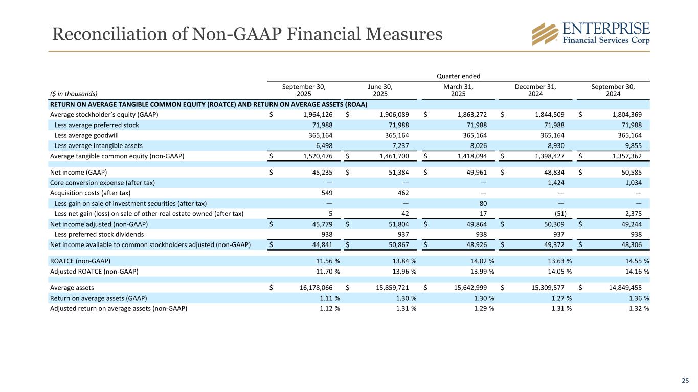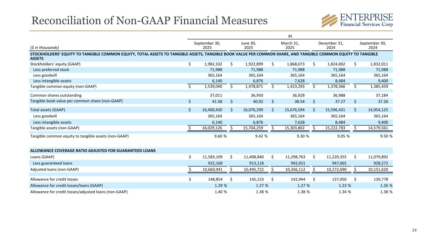 24 Reconciliation of Non-GAAP Financial Measures At ($ in thousands) September 30, 2025 June 30, 2025 March 31, 2025 December 31, 2024 September 30, 2024 STOCKHOLDERS’ EQUITY TO TANGIBLE COMMON EQUITY, TOTAL ASSETS TO TANGIBLE ASSETS, TANGIBLE BOOK VALUE PER COMMON SHARE, AND TANGIBLE COMMON EQUITY TO TANGIBLE ASSETS Stockholders’ equity (GAAP) $ 1,982,332 $ 1,922,899 $ 1,868,073 $ 1,824,002 $ 1,832,011 Less preferred stock 71,988 71,988 71,988 71,988 71,988 Less goodwill 365,164 365,164 365,164 365,164 365,164 Less intangible assets 6,140 6,876 7,628 8,484 9,400 Tangible common equity (non-GAAP) $ 1,539,040 $ 1,478,871 $ 1,423,293 $ 1,378,366 $ 1,385,459 Common shares outstanding 37,011 36,950 36,928 36,988 37,184 Tangible book value per common share (non-GAAP) $ 41.58 $ 40.02 $ 38.54 $ 37.27 $ 37.26 Total assets (GAAP) $ 16,400,430 $ 16,076,299 $ 15,676,594 $ 15,596,431 $ 14,954,125 Less goodwill 365,164 365,164 365,164 365,164 365,164 Less intangible assets 6,140 6,876 7,628 8,484 9,400 Tangible assets (non-GAAP) $ 16,029,126 $ 15,704,259 $ 15,303,802 $ 15,222,783 $ 14,579,561 Tangible common equity to tangible assets (non-GAAP) 9.60 % 9.42 % 9.30 % 9.05 % 9.50 % ALLOWANCE COVERAGE RATIO ADJUSTED FOR GUARANTEED LOANS Loans (GAAP) $ 11,583,109 $ 11,408,840 $ 11,298,763 $ 11,220,355 $ 11,079,892 Less guaranteed loans 922,168 913,118 942,651 947,665 928,272 Adjusted loans (non-GAAP) $ 10,660,941 $ 10,495,722 $ 10,356,112 $ 10,272,690 $ 10,151,620 Allowance for credit losses $ 148,854 $ 145,133 $ 142,944 $ 137,950 $ 139,778 Allowance for credit losses/loans (GAAP) 1.29 % 1.27 % 1.27 % 1.23 % 1.26 % Allowance for credit losses/adjusted loans (non-GAAP) 1.40 % 1.38 % 1.38 % 1.34 % 1.38 %