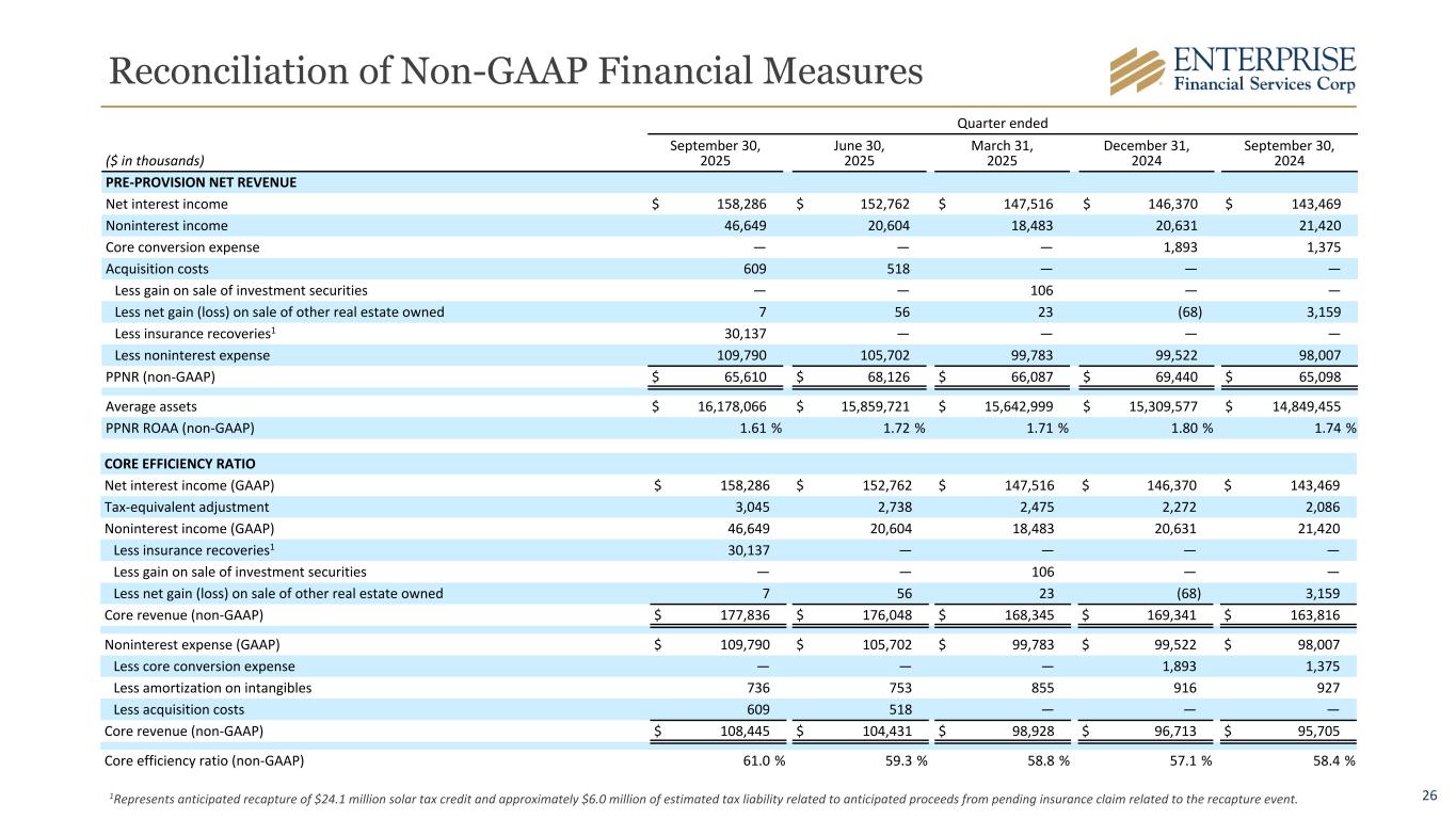 25 Reconciliation of Non-GAAP Financial Measures Quarter ended ($ in thousands) September 30, 2025 June 30, 2025 March 31, 2025 December 31, 2024 September 30, 2024 RETURN ON AVERAGE TANGIBLE COMMON EQUITY (ROATCE) AND RETURN ON AVERAGE ASSETS (ROAA) Average stockholder’s equity (GAAP) $ 1,964,126 $ 1,906,089 $ 1,863,272 $ 1,844,509 $ 1,804,369 Less average preferred stock 71,988 71,988 71,988 71,988 71,988 Less average goodwill 365,164 365,164 365,164 365,164 365,164 Less average intangible assets 6,498 7,237 8,026 8,930 9,855 Average tangible common equity (non-GAAP) $ 1,520,476 $ 1,461,700 $ 1,418,094 $ 1,398,427 $ 1,357,362 Net income (GAAP) $ 45,235 $ 51,384 $ 49,961 $ 48,834 $ 50,585 Core conversion expense (after tax) — — — 1,424 1,034 Acquisition costs (after tax) 549 462 — — — Less gain on sale of investment securities (after tax) — — 80 — — Less net gain (loss) on sale of other real estate owned (after tax) 5 42 17 (51) 2,375 Net income adjusted (non-GAAP) $ 45,779 $ 51,804 $ 49,864 $ 50,309 $ 49,244 Less preferred stock dividends 938 937 938 937 938 Net income available to common stockholders adjusted (non-GAAP) $ 44,841 $ 50,867 $ 48,926 $ 49,372 $ 48,306 ROATCE (non-GAAP) 11.56 % 13.84 % 14.02 % 13.63 % 14.55 % Adjusted ROATCE (non-GAAP) 11.70 % 13.96 % 13.99 % 14.05 % 14.16 % Average assets $ 16,178,066 $ 15,859,721 $ 15,642,999 $ 15,309,577 $ 14,849,455 Return on average assets (GAAP) 1.11 % 1.30 % 1.30 % 1.27 % 1.36 % Adjusted return on average assets (non-GAAP) 1.12 % 1.31 % 1.29 % 1.31 % 1.32 %