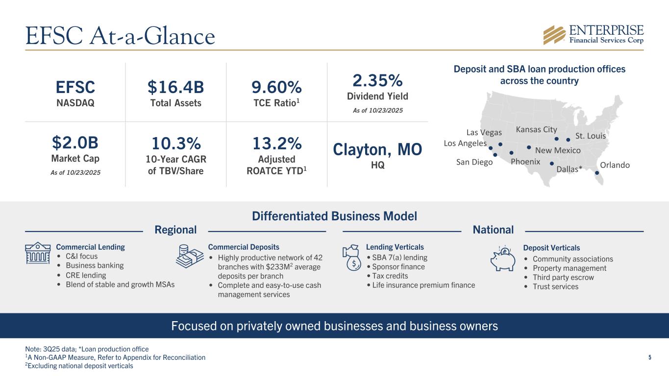 2 Forward-Looking Statements Some of the information in this report may contain “forward-looking statements” within the meaning of and intended to be covered by the safe harbor provisions of the Private Securities Litigation Reform Act of 1995. Such forward-looking statements may include projections based on management’s current expectations and beliefs concerning future developments and their potential effects on the Company including, without limitation, plans, strategies and goals, and statements about the Company’s expectations regarding revenue and asset growth, financial performance and profitability, loan and deposit growth, liquidity, yields and returns, loan diversification and credit management, stockholder value creation and the impact of acquisitions. Forward-looking statements are typically identified by words such as “believe,” “expect,” “anticipate,” “intend,” “outlook,” “estimate,” “forecast,” “project,” “pro forma,” “pipeline” and other similar words and expressions. Forward-looking statements are subject to numerous assumptions, risks and uncertainties, which change over time. Forward-looking statements speak only as of the date they are made. Because forward-looking statements are subject to assumptions and uncertainties, actual results or future events could differ, possibly materially, from those anticipated in the forward-looking statements and future results could differ materially from historical performance. They are neither statements of historical fact nor guarantees or assurances of future performance. While there is no assurance that any list of risks and uncertainties or risk factors is complete, important factors that could cause actual results to differ materially from those in the forward-looking statements include the following, without limitation: our ability to efficiently integrate acquisitions into our operations, retain the customers of these businesses and grow the acquired operations; our ability to collect insurance proceeds from claims made related to tax recapture events; credit risk; changes in the appraised valuation of real estate securing impaired loans; outcomes of litigation and other contingencies; exposure to general and local economic and market conditions, high unemployment rates, higher inflation and its impacts (including U.S. federal government measures to address higher inflation), impacts of trade and tariff policies, U.S. fiscal debt, budget and tax matters (including the effect of a prolonged U.S. federal government shutdown), and any slowdown in global economic growth; risks associated with rapid increases or decreases in prevailing interest rates; our ability to attract and retain deposits and access to other sources of liquidity; changes in business prospects that could impact goodwill estimates and assumptions; consolidation within the banking industry; competition from banks and other financial institutions; the ability to attract and retain relationship officers and other key personnel; burdens imposed by federal and state regulation; changes in legislative or regulatory requirements, as well as current, pending or future legislation or regulation that could have a negative effect on our revenue and business, including rules and regulations relating to bank products and financial services; changes in accounting policies and practices or accounting standards; natural disasters (including wildfires and earthquakes); terrorist activities, war and geopolitical matters (including the war in Israel and potential for a broader regional conflict and the war in Ukraine and the imposition of additional sanctions and export controls in connection therewith), or pandemics, or other health emergencies and their effects on economic and business environments in which we operate, including the related disruption to the financial market and other economic activity; and those factors and risks referenced from time to time in the Company’s filings with the Securities and Exchange Commission (the “SEC”), including in the Company’s Annual Report on Form 10-K for the fiscal year ended December 31, 2024, and the Company’s other filings with the SEC. The Company cautions that the preceding list is not exhaustive of all possible risk factors and other factors could also adversely affect the Company’s results. For any forward-looking statements made in this press release or in any documents, EFSC claims the protection of the safe harbor for forward-looking statements contained in the Private Securities Litigation Reform Act of 1995. Annualized, pro forma, projected and estimated numbers in this document are used for illustrative purposes only, are not forecasts and may not reflect actual results. Readers are cautioned not to place undue reliance on any forward-looking statements. Except to the extent required by applicable law or regulation, EFSC disclaims any obligation to revise or publicly release any revision or update to any of the forward-looking statements included herein to reflect events or circumstances that occur after the date on which such statements were made.