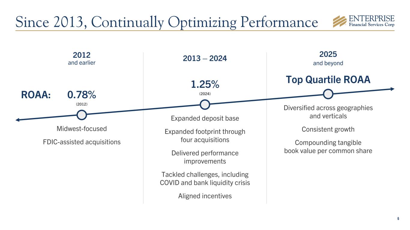 5 Differentiated Business Model Focused on privately owned businesses and business owners Commercial Deposits • Highly productive network of 42 branches with $233M2 average deposits per branch • Complete and easy-to-use cash management services Deposit Verticals • Community associations • Property management • Third party escrow • Trust services Deposit and SBA loan production offices across the country Commercial Lending • C&I focus • Business banking • CRE lending • Blend of stable and growth MSAs Lending Verticals • SBA 7(a) lending • Sponsor finance • Tax credits • Life insurance premium finance EFSC NASDAQ $16.4B Total Assets 9.60% TCE Ratio1 2.35% Dividend Yield As of 10/23/2025 $2.0B Market Cap As of 10/23/2025 10.3% 10-Year CAGR of TBV/Share 13.2% Adjusted ROATCE YTD1 Clayton, MO HQ Note: 3Q25 data; *Loan production office 1A Non-GAAP Measure, Refer to Appendix for Reconciliation 2Excluding national deposit verticals St. Louis Kansas City Phoenix New Mexico Los Angeles Las Vegas San Diego Dallas* Orlando EFSC At-a-Glance Regional National