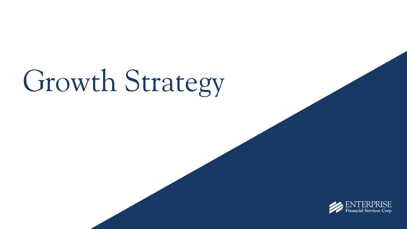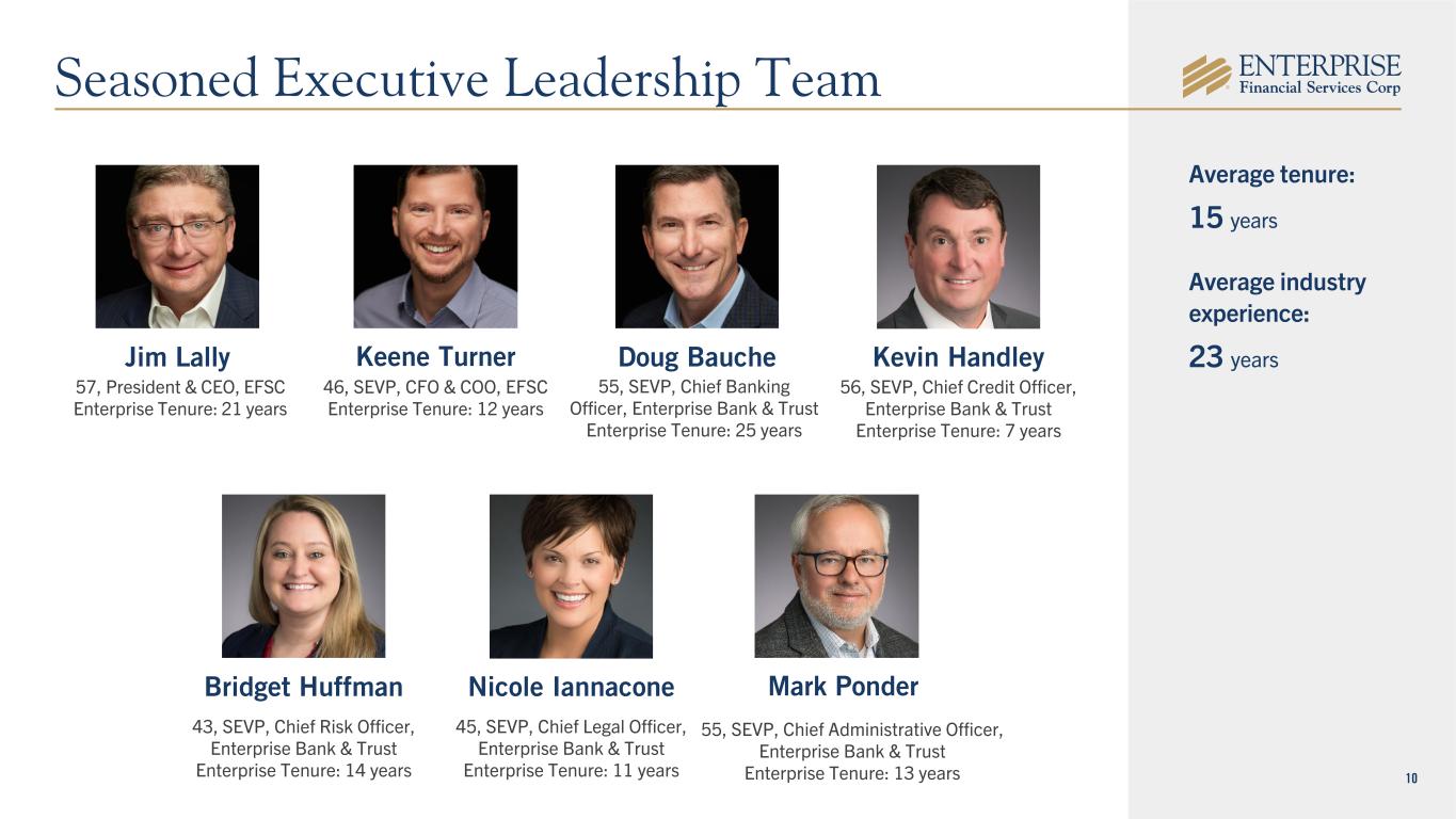 10 57, President & CEO, EFSC Enterprise Tenure: 21 years 46, SEVP, CFO & COO, EFSC Enterprise Tenure: 12 years 56, SEVP, Chief Credit Officer, Enterprise Bank & Trust Enterprise Tenure: 7 years 55, SEVP, Chief Banking Officer, Enterprise Bank & Trust Enterprise Tenure: 25 years 55, SEVP, Chief Administrative Officer, Enterprise Bank & Trust Enterprise Tenure: 13 years 45, SEVP, Chief Legal Officer, Enterprise Bank & Trust Enterprise Tenure: 11 years 43, SEVP, Chief Risk Officer, Enterprise Bank & Trust Enterprise Tenure: 14 years Average tenure: 15 years Average industry experience: 23 years Seasoned Executive Leadership Team Jim Lally Keene Turner Doug Bauche Kevin Handley Bridget Huffman Nicole Iannacone Mark Ponder