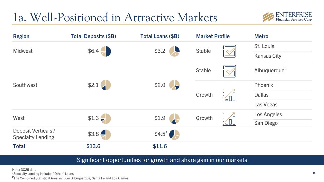 15 Significant opportunities for growth and share gain in our markets Region Total Deposits ($B) Total Loans ($B) Market Profile Metro Midwest $6.4 $3.2 Stable St. Louis Kansas City Southwest $2.1 $2.0 Stable Albuquerque2 Growth Phoenix Dallas Las Vegas West $1.3 $1.9 Growth Los Angeles San Diego Deposit Verticals / Specialty Lending $3.8 $4.5 Total $13.6 $11.6 Note: 3Q25 data 1Specialty Lending includes "Other" Loans 2The Combined Statistical Area includes Albuquerque, Santa Fe and Los Alamos 1 1a. Well-Positioned in Attractive Markets