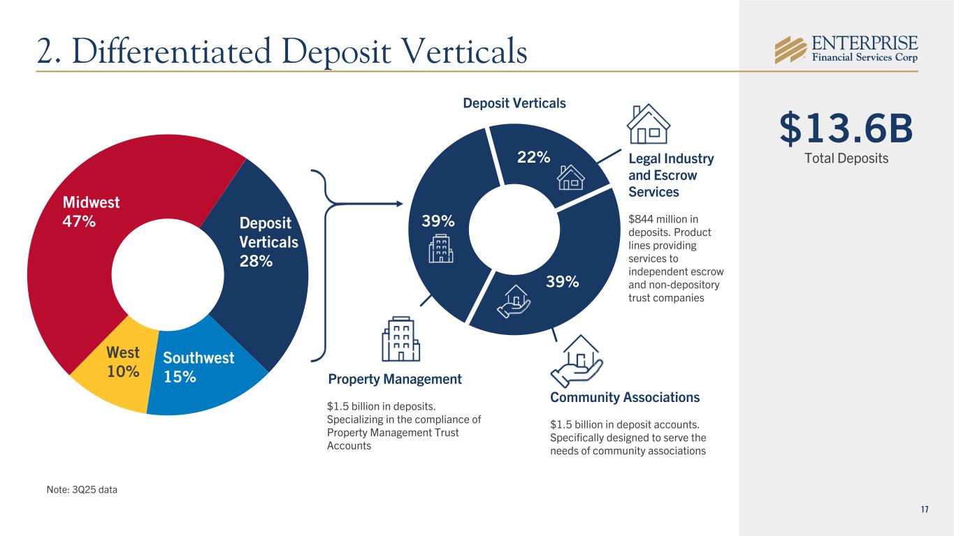 16 ($ in thousands) % of Total CRE $ 216,569 72.8 % C&I 66,692 22.4 % Other 14,162 4.8 % Total Loans $ 297,423 100.0 % Strategic Rationale Loans Deposits 10 Branches $585M Total Deposits $223M Total Loans 32% Variable Rate Loans 33% NIB $56M Total Deposits $74M Total Loans 29% Variable Rate Loans • Unique opportunity to accelerate investment and scale for AZ and KC markets • Commercially oriented banking franchise ($ in thousands) % of Total Transaction Accounts $ 344,604 53.7 % MMDA + Savings 237,403 37.0 % Retail Time (<$250K) 28,555 4.5 % Jumbo Time (>$250K) 31,018 4.8 % Total Deposits $ 641,580 100.0 % • Expands branch presence and market share in “scarce” Phoenix MSA • Immediately leverages excess capital in strategic, low risk transaction 2 Branches 46% NIB Kansas • Favorable earnback compared to alternative capital uses • Attractively priced deposit portfolio • High quality talent acquisitions • Top 15 pro forma deposit market share in both markets • Mid to high single digit full year EPS accretion Transaction Overview • Acquisition of 12 branches in Arizona and Kansas • No capital raise or share issuance required • Structured as a purchase and assumption agreement • Successful conversion completed on October 10, 2025 • Balances are as of the closing of the acquisition Arizona 1b. Accelerating Growth - Primarily in Arizona