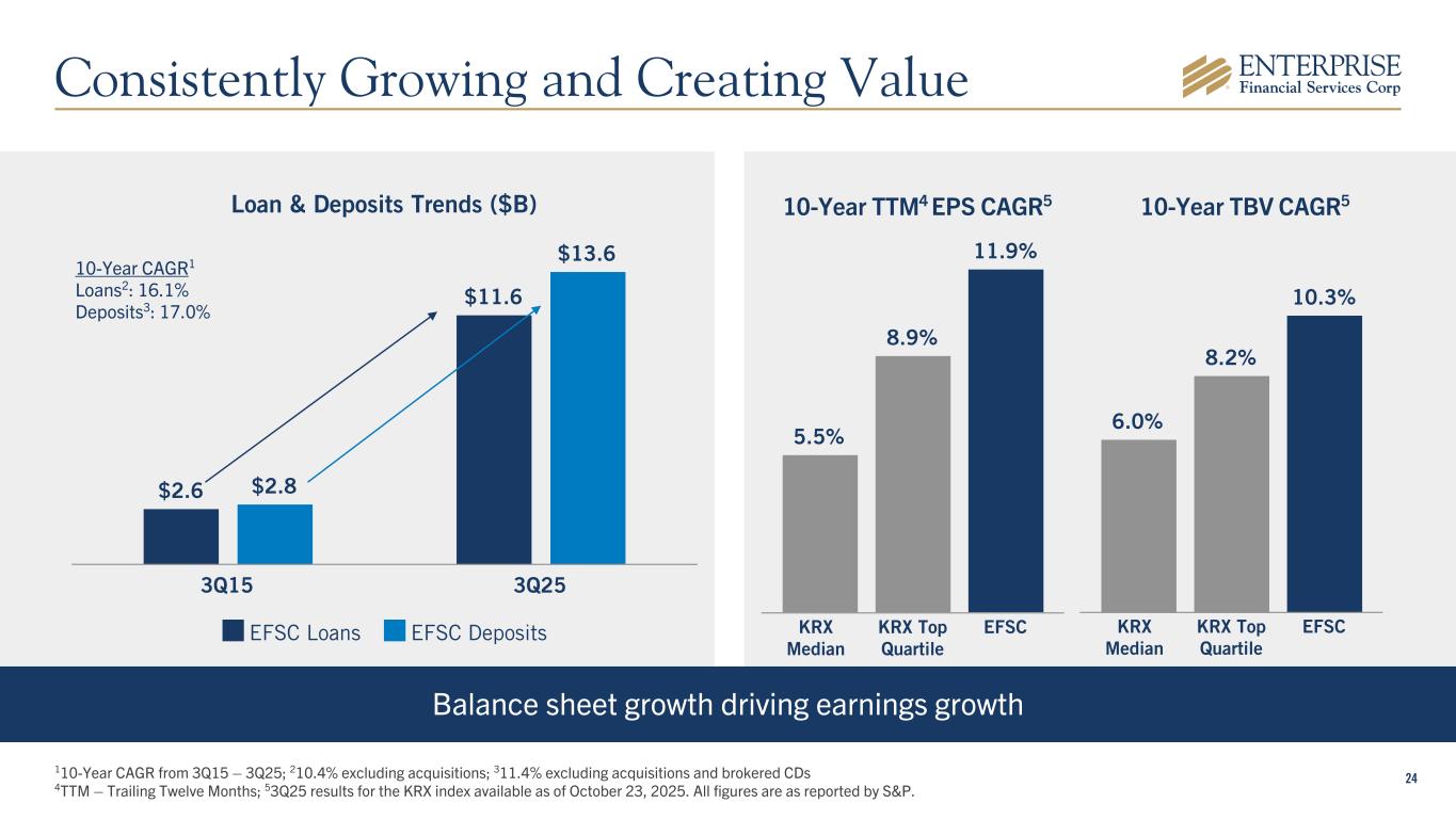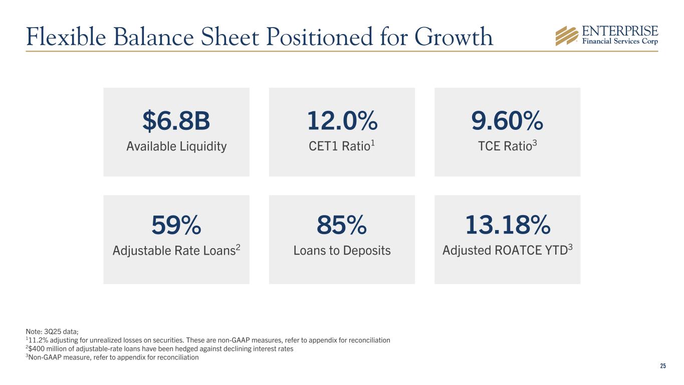 24 Loan & Deposits Trends ($B) $2.6 $11.6 $2.8 $13.6 EFSC Loans EFSC Deposits 3Q15 3Q25 Balance sheet growth driving earnings growth 10-Year TBV CAGR510-Year TTM4 EPS CAGR5 110-Year CAGR from 3Q15 – 3Q25; 210.4% excluding acquisitions; 311.4% excluding acquisitions and brokered CDs 4TTM – Trailing Twelve Months; 53Q25 results for the KRX index available as of October 23, 2025. All figures are as reported by S&P. 10-Year CAGR1 Loans2: 16.1% Deposits3: 17.0% 5.5% 8.9% 11.9% KRX Median KRX Top Quartile EFSC 6.0% 8.2% 10.3% KRX Median KRX Top Quartile EFSC Consistently Growing and Creating Value