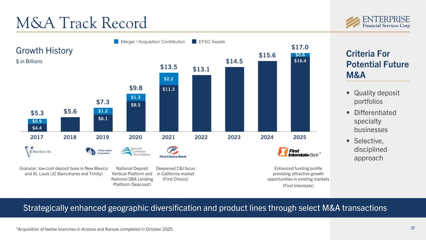 26 High Capital Retention Rate • Strong earnings profile • Sustainable dividend profile Support Robust Asset Growth • Organic loan and deposit growth • High-quality M&A to enhance commercial franchise and geographic diversification Maintain High-Quality Capital Stack • Minimize WACC over time (preferred, sub debt, etc.) • Optimize capital levels CET1 ~10%, Tier 1 ~12%, and Total Capital ~14% Maintain 8-9% TCE • M&A deal structures • Drives ROATCE above peer levels Capital Allocation Priorities • Maintain TCE ratio of 8-9% • Active stock repurchase program • Regular dividend increases • Strategic flexibility for organic growth, M&A and other uses of capital Low Cost, Highly Flexible Capital Strategy