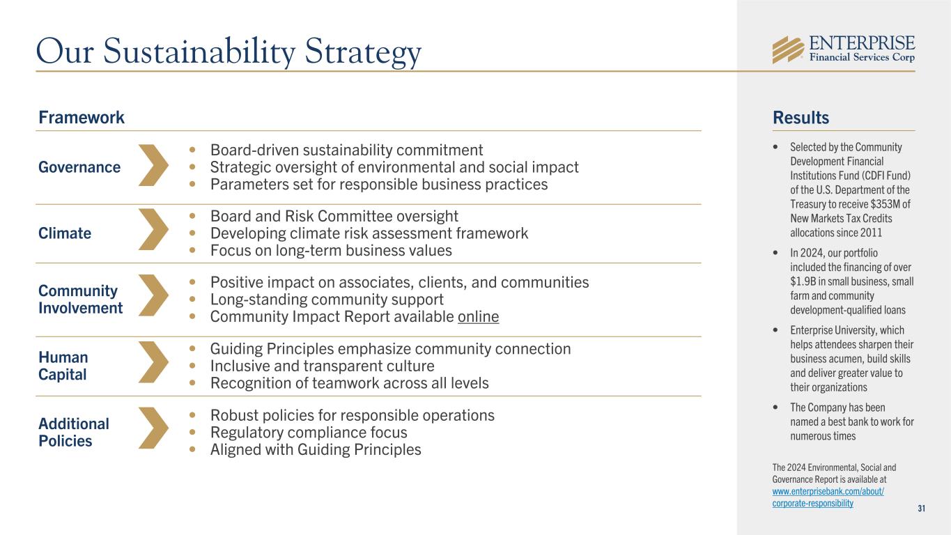 31 • Selected by the Community Development Financial Institutions Fund (CDFI Fund) of the U.S. Department of the Treasury to receive $353M of New Markets Tax Credits allocations since 2011 • In 2024, our portfolio included the financing of over $1.9B in small business, small farm and community development-qualified loans • Enterprise University, which helps attendees sharpen their business acumen, build skills and deliver greater value to their organizations • The Company has been named a best bank to work for numerous times Framework Governance • Board-driven sustainability commitment • Strategic oversight of environmental and social impact • Parameters set for responsible business practices Climate • Board and Risk Committee oversight • Developing climate risk assessment framework • Focus on long-term business values Community Involvement • Positive impact on associates, clients, and communities • Long-standing community support • Community Impact Report available online Human Capital • Guiding Principles emphasize community connection • Inclusive and transparent culture • Recognition of teamwork across all levels Additional Policies • Robust policies for responsible operations • Regulatory compliance focus • Aligned with Guiding Principles Results The 2024 Environmental, Social and Governance Report is available at www.enterprisebank.com/about/ corporate-responsibility Our Sustainability Strategy