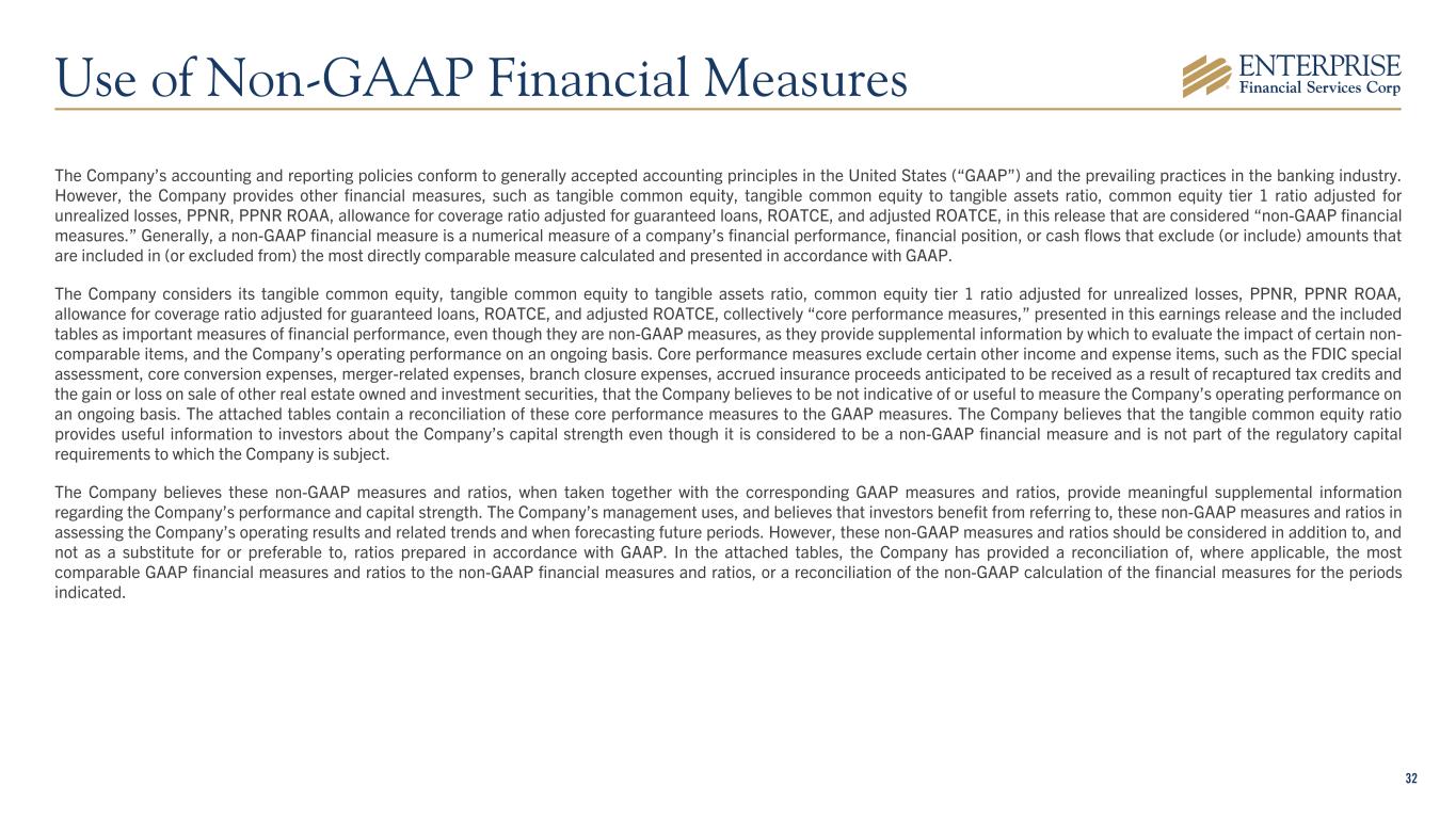 32 The Company’s accounting and reporting policies conform to generally accepted accounting principles in the United States (“GAAP”) and the prevailing practices in the banking industry. However, the Company provides other financial measures, such as tangible common equity, tangible common equity to tangible assets ratio, common equity tier 1 ratio adjusted for unrealized losses, PPNR, PPNR ROAA, allowance for coverage ratio adjusted for guaranteed loans, ROATCE, and adjusted ROATCE, in this release that are considered “non-GAAP financial measures.” Generally, a non-GAAP financial measure is a numerical measure of a company’s financial performance, financial position, or cash flows that exclude (or include) amounts that are included in (or excluded from) the most directly comparable measure calculated and presented in accordance with GAAP. The Company considers its tangible common equity, tangible common equity to tangible assets ratio, common equity tier 1 ratio adjusted for unrealized losses, PPNR, PPNR ROAA, allowance for coverage ratio adjusted for guaranteed loans, ROATCE, and adjusted ROATCE, collectively “core performance measures,” presented in this earnings release and the included tables as important measures of financial performance, even though they are non-GAAP measures, as they provide supplemental information by which to evaluate the impact of certain non- comparable items, and the Company’s operating performance on an ongoing basis. Core performance measures exclude certain other income and expense items, such as the FDIC special assessment, core conversion expenses, merger-related expenses, branch closure expenses, accrued insurance proceeds anticipated to be received as a result of recaptured tax credits and the gain or loss on sale of other real estate owned and investment securities, that the Company believes to be not indicative of or useful to measure the Company’s operating performance on an ongoing basis. The attached tables contain a reconciliation of these core performance measures to the GAAP measures. The Company believes that the tangible common equity ratio provides useful information to investors about the Company’s capital strength even though it is considered to be a non-GAAP financial measure and is not part of the regulatory capital requirements to which the Company is subject. The Company believes these non-GAAP measures and ratios, when taken together with the corresponding GAAP measures and ratios, provide meaningful supplemental information regarding the Company’s performance and capital strength. The Company’s management uses, and believes that investors benefit from referring to, these non-GAAP measures and ratios in assessing the Company’s operating results and related trends and when forecasting future periods. However, these non-GAAP measures and ratios should be considered in addition to, and not as a substitute for or preferable to, ratios prepared in accordance with GAAP. In the attached tables, the Company has provided a reconciliation of, where applicable, the most comparable GAAP financial measures and ratios to the non-GAAP financial measures and ratios, or a reconciliation of the non-GAAP calculation of the financial measures for the periods indicated. Use of Non-GAAP Financial Measures