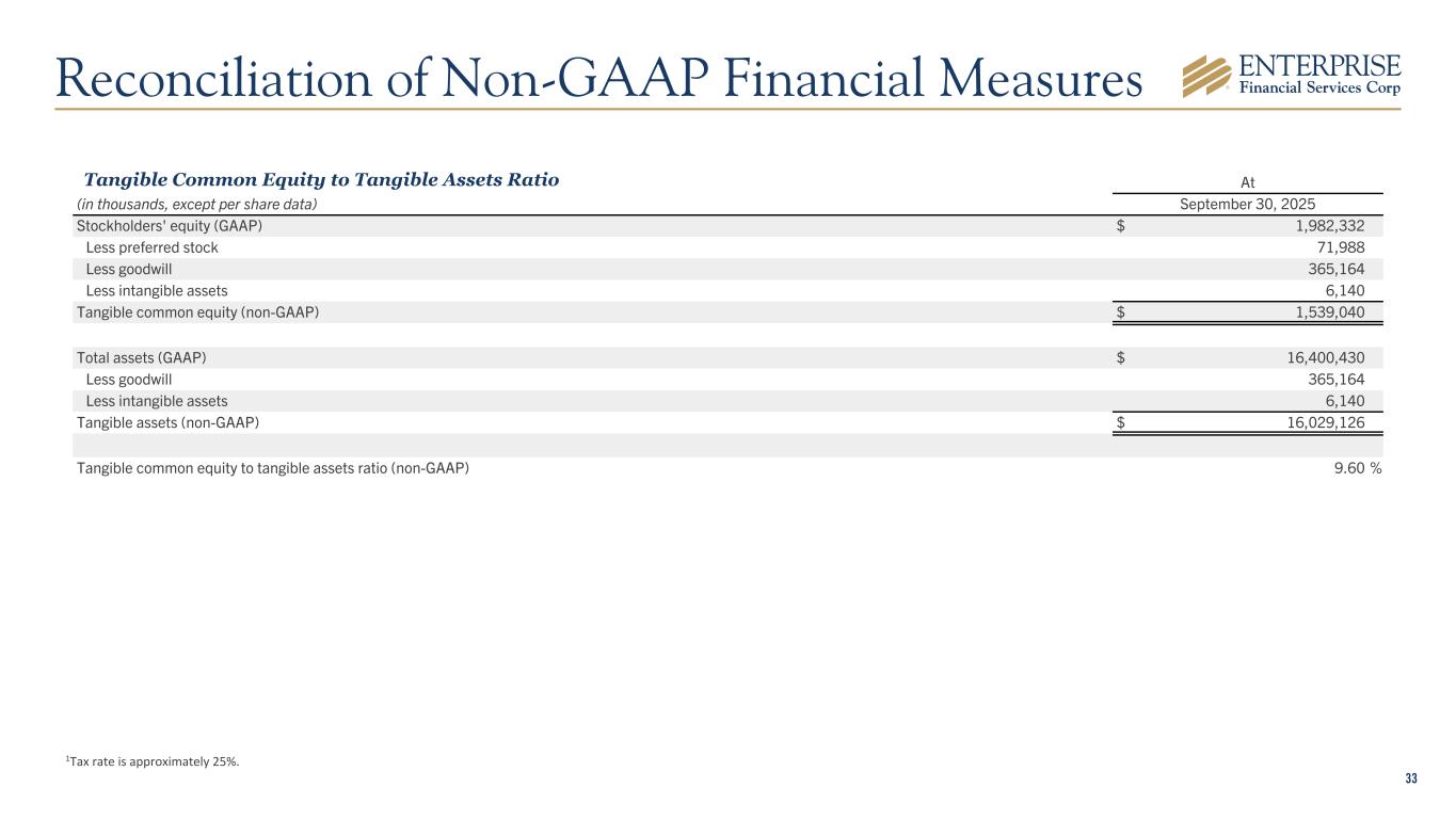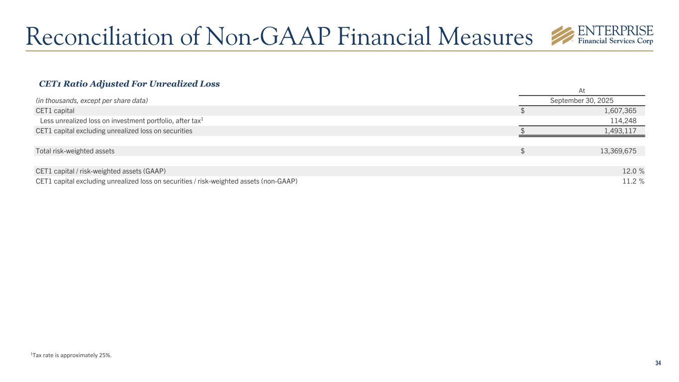 33 At (in thousands, except per share data) September 30, 2025 Stockholders' equity (GAAP) $ 1,982,332 Less preferred stock 71,988 Less goodwill 365,164 Less intangible assets 6,140 Tangible common equity (non-GAAP) $ 1,539,040 Total assets (GAAP) $ 16,400,430 Less goodwill 365,164 Less intangible assets 6,140 Tangible assets (non-GAAP) $ 16,029,126 Tangible common equity to tangible assets ratio (non-GAAP) 9.60 % 1Tax rate is approximately 25%. Tangible Common Equity to Tangible Assets Ratio Reconciliation of Non-GAAP Financial Measures