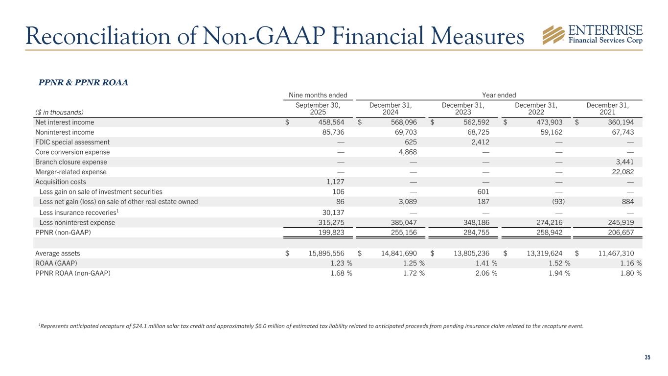 34 At (in thousands, except per share data) September 30, 2025 CET1 capital $ 1,607,365 Less unrealized loss on investment portfolio, after tax1 114,248 CET1 capital excluding unrealized loss on securities $ 1,493,117 Total risk-weighted assets $ 13,369,675 CET1 capital / risk-weighted assets (GAAP) 12.0 % CET1 capital excluding unrealized loss on securities / risk-weighted assets (non-GAAP) 11.2 % CET1 Ratio Adjusted For Unrealized Loss Reconciliation of Non-GAAP Financial Measures 1Tax rate is approximately 25%.