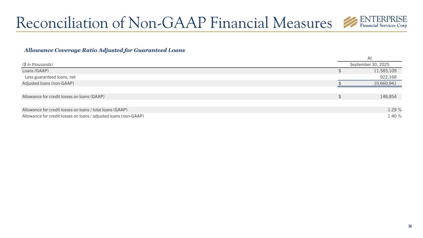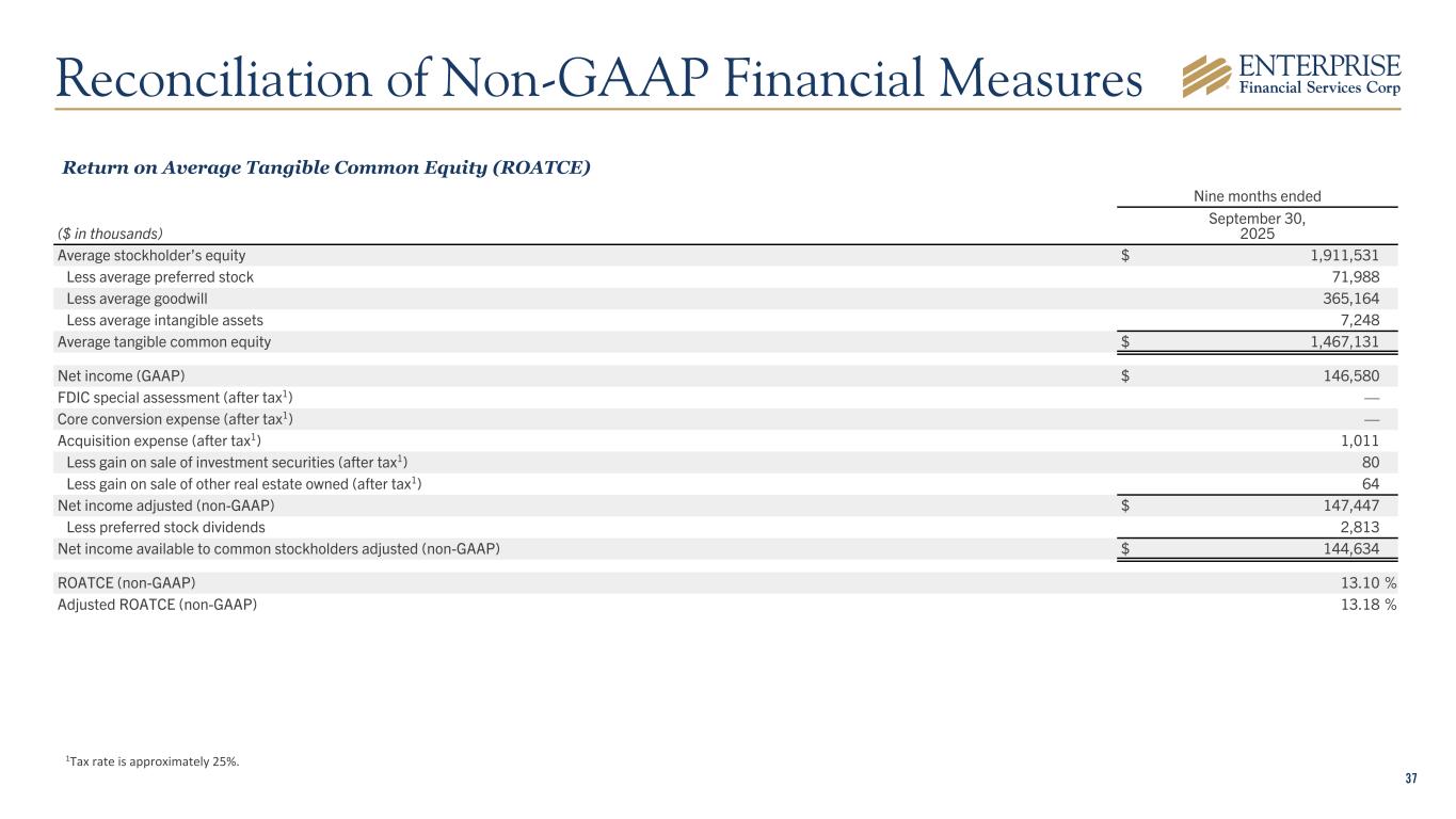 36 Allowance Coverage Ratio Adjusted for Guaranteed Loans At ($ in thousands) September 30, 2025 Loans (GAAP) $ 11,583,109 Less guaranteed loans, net 922,168 Adjusted loans (non-GAAP) $ 10,660,941 Allowance for credit losses on loans (GAAP) $ 148,854 Allowance for credit losses on loans / total loans (GAAP) 1.29 % Allowance for credit losses on loans / adjusted loans (non-GAAP) 1.40 % Reconciliation of Non-GAAP Financial Measures