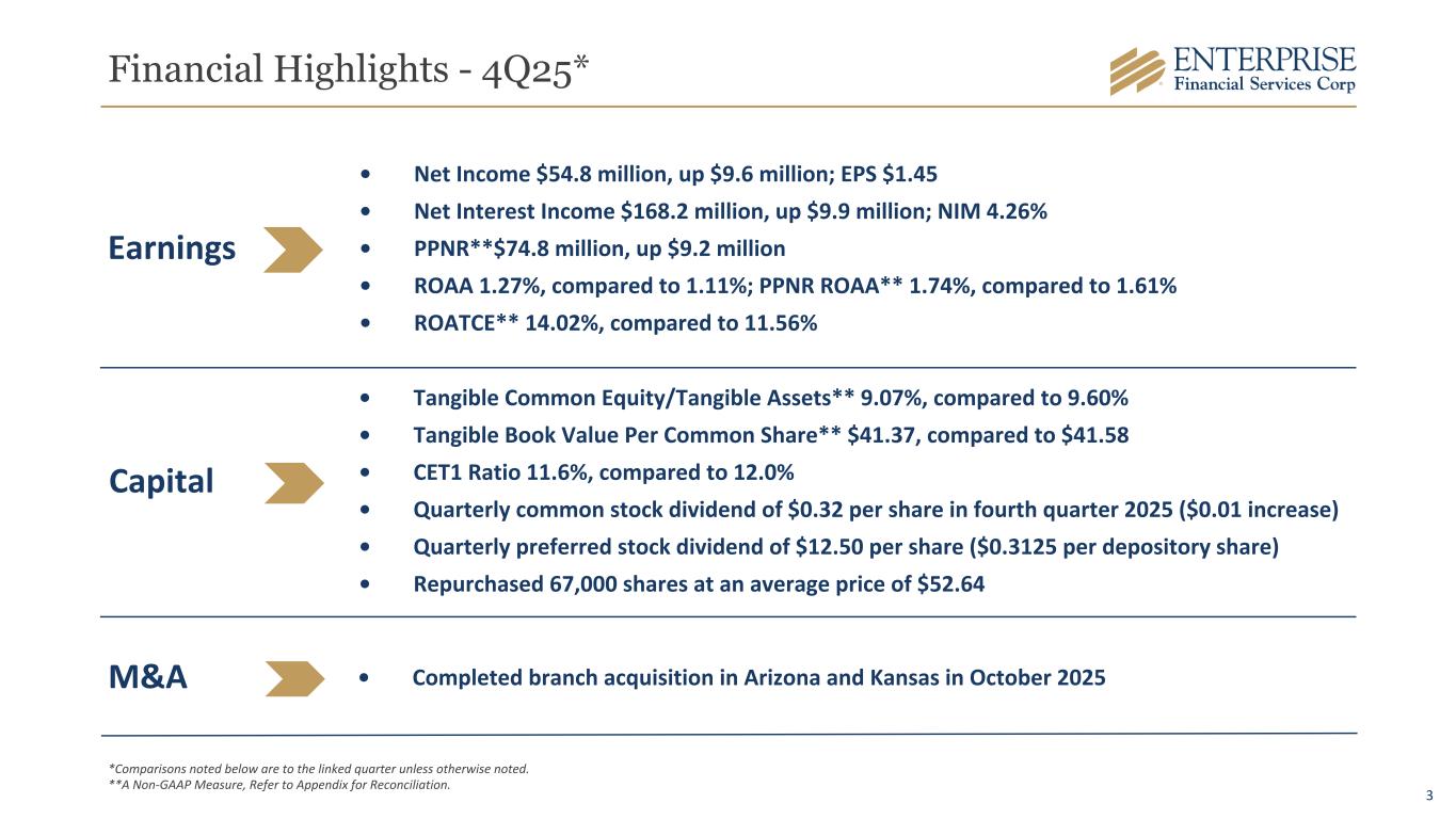 2 Some of the information in this report may contain “forward-looking statements” within the meaning of and intended to be covered by the safe harbor provisions of the Private Securities Litigation Reform Act of 1995. Such forward-looking statements may include projections based on management’s current expectations and beliefs concerning future developments and their potential effects on the Company including, without limitation, plans, strategies and goals, and statements about the Company’s expectations regarding revenue and asset growth, financial performance and profitability, loan and deposit growth, liquidity, yields and returns, loan diversification and credit management, stockholder value creation and the impact of acquisitions. Forward-looking statements are typically identified by words such as “believe,” “expect,” “anticipate,” “intend,” “outlook,” “estimate,” “forecast,” “project,” “pro forma,” “pipeline” and other similar words and expressions. Forward-looking statements are subject to numerous assumptions, risks and uncertainties, which change over time. Forward-looking statements speak only as of the date they are made. Because forward-looking statements are subject to assumptions and uncertainties, actual results or future events could differ, possibly materially, from those anticipated in the forward-looking statements and future results could differ materially from historical performance. They are neither statements of historical fact nor guarantees or assurances of future performance. While there is no assurance that any list of risks and uncertainties or risk factors is complete, important factors that could cause actual results to differ materially from those in the forward-looking statements include the following, without limitation: our ability to efficiently integrate acquisitions into our operations, retain the customers of these businesses and grow the acquired operations; our ability to collect insurance proceeds from claims made related to tax recapture events; credit risk; changes in the appraised valuation of real estate securing impaired loans; outcomes of litigation and other contingencies; exposure to general and local economic and market conditions, high unemployment rates, higher inflation and its impacts (including U.S. federal government measures to address higher inflation), impacts of trade and tariff policies, U.S. fiscal debt, budget and tax matters (including the effect of a prolonged U.S. federal government shutdown), and any slowdown in global economic growth; risks associated with rapid increases or decreases in prevailing interest rates; our ability to attract and retain deposits and access to other sources of liquidity; changes in business prospects that could impact goodwill estimates and assumptions; consolidation within the banking industry; competition from banks and other financial institutions; the ability to attract and retain relationship officers and other key personnel; burdens imposed by federal and state regulation; changes in legislative or regulatory requirements, as well as current, pending or future legislation or regulation that could have a negative effect on our revenue and business, including rules and regulations relating to bank products and financial services; changes in accounting policies and practices or accounting standards; natural disasters (including wildfires and earthquakes); terrorist activities, war and geopolitical matters (including the war in Israel and potential for a broader regional conflict and the war in Ukraine and the imposition of additional sanctions and export controls in connection therewith), or pandemics, or other health emergencies and their effects on economic and business environments in which we operate, including the related disruption to the financial market and other economic activity; and those factors and risks referenced from time to time in the Company’s filings with the Securities and Exchange Commission (the “SEC”), including in the Company’s Annual Report on Form 10-K for the fiscal year ended December 31, 2024, and the Company’s other filings with the SEC. The Company cautions that the preceding list is not exhaustive of all possible risk factors and other factors could also adversely affect the Company’s results. For any forward-looking statements made in this press release or in any documents, EFSC claims the protection of the safe harbor for forward-looking statements contained in the Private Securities Litigation Reform Act of 1995. Annualized, pro forma, projected and estimated numbers in this document are used for illustrative purposes only, are not forecasts and may not reflect actual results. Readers are cautioned not to place undue reliance on any forward-looking statements. Except to the extent required by applicable law or regulation, EFSC disclaims any obligation to revise or publicly release any revision or update to any of the forward-looking statements included herein to reflect events or circumstances that occur after the date on which such statements were made. Forward-Looking Statements