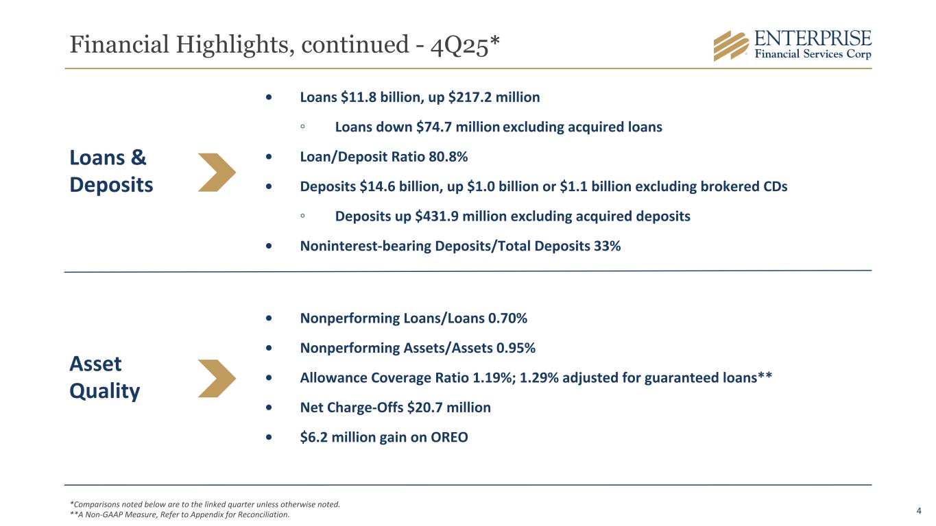 3 Financial Highlights - 4Q25* Capital • Tangible Common Equity/Tangible Assets** 9.07%, compared to 9.60% • Tangible Book Value Per Common Share** $41.37, compared to $41.58 • CET1 Ratio 11.6%, compared to 12.0% • Quarterly common stock dividend of $0.32 per share in fourth quarter 2025 ($0.01 increase) • Quarterly preferred stock dividend of $12.50 per share ($0.3125 per depository share) • Repurchased 67,000 shares at an average price of $52.64 • Net Income $54.8 million, up $9.6 million; EPS $1.45 • Net Interest Income $168.2 million, up $9.9 million; NIM 4.26% • PPNR**$74.8 million, up $9.2 million • ROAA 1.27%, compared to 1.11%; PPNR ROAA** 1.74%, compared to 1.61% • ROATCE** 14.02%, compared to 11.56% Earnings *Comparisons noted below are to the linked quarter unless otherwise noted. **A Non-GAAP Measure, Refer to Appendix for Reconciliation. M&A • Completed branch acquisition in Arizona and Kansas in October 2025