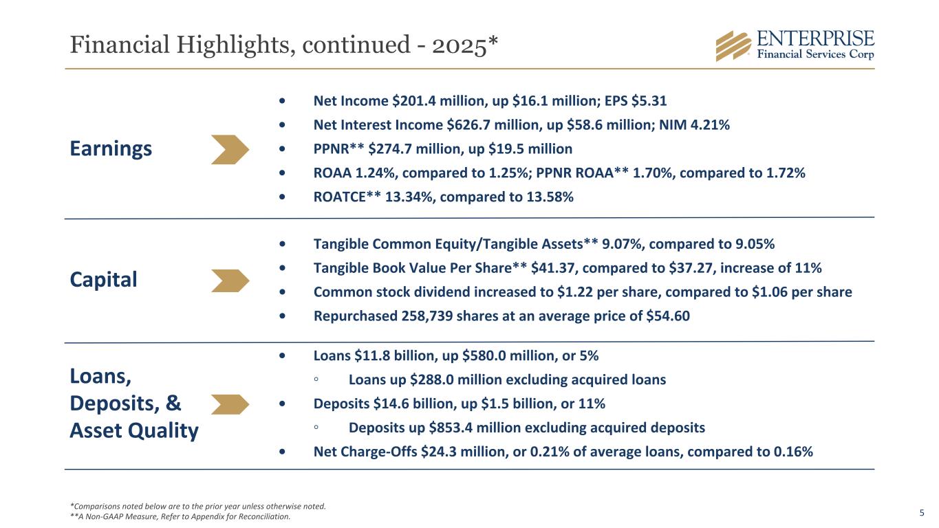 4 Financial Highlights, continued - 4Q25* *Comparisons noted below are to the linked quarter unless otherwise noted. **A Non-GAAP Measure, Refer to Appendix for Reconciliation. Loans & Deposits • Loans $11.8 billion, up $217.2 million ◦ Loans down $74.7 million excluding acquired loans • Loan/Deposit Ratio 80.8% • Deposits $14.6 billion, up $1.0 billion or $1.1 billion excluding brokered CDs ◦ Deposits up $431.9 million excluding acquired deposits • Noninterest-bearing Deposits/Total Deposits 33% Asset Quality • Nonperforming Loans/Loans 0.70% • Nonperforming Assets/Assets 0.95% • Allowance Coverage Ratio 1.19%; 1.29% adjusted for guaranteed loans** • Net Charge-Offs $20.7 million • $6.2 million gain on OREO