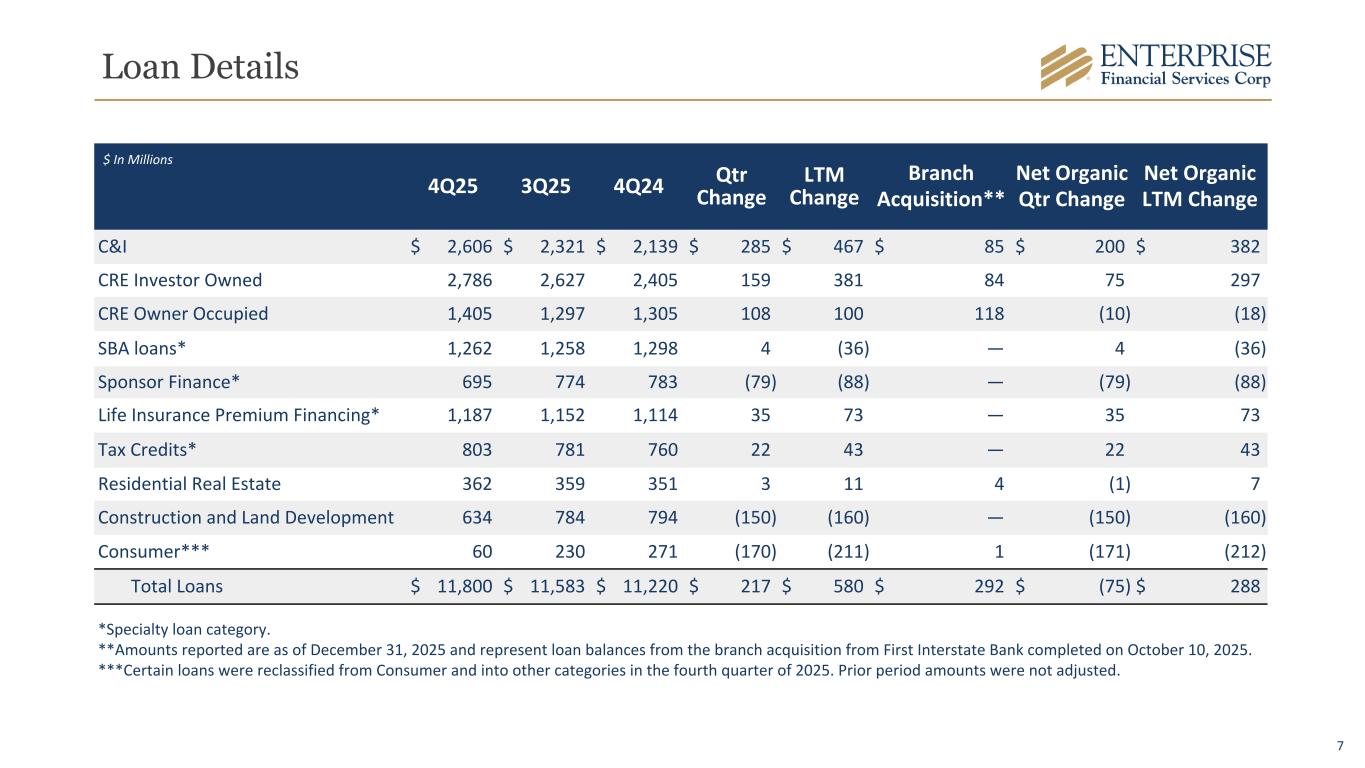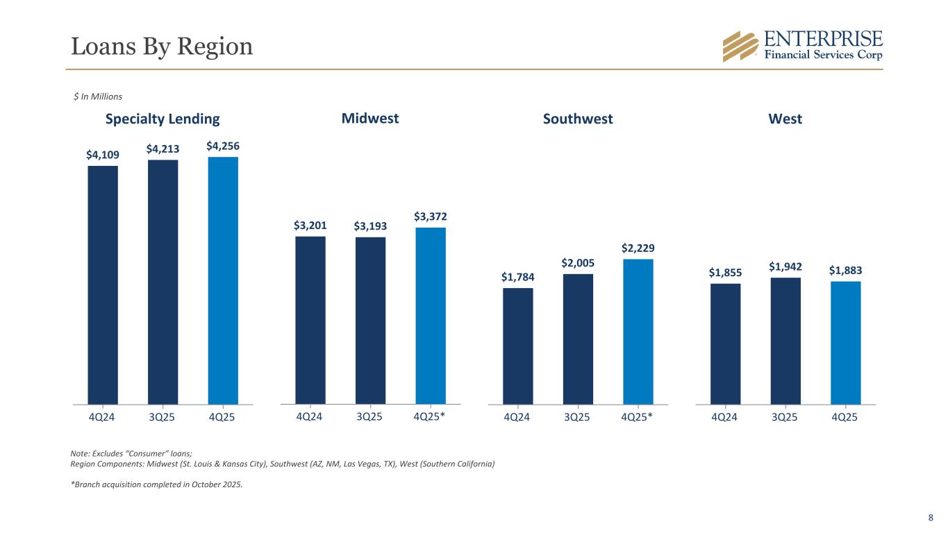 7 Loan Details 4Q25 3Q25 4Q24 Qtr Change LTM Change Branch Acquisition** Net Organic Qtr Change Net Organic LTM Change C&I $ 2,606 $ 2,321 $ 2,139 $ 285 $ 467 $ 85 $ 200 $ 382 CRE Investor Owned 2,786 2,627 2,405 159 381 84 75 297 CRE Owner Occupied 1,405 1,297 1,305 108 100 118 (10) (18) SBA loans* 1,262 1,258 1,298 4 (36) — 4 (36) Sponsor Finance* 695 774 783 (79) (88) — (79) (88) Life Insurance Premium Financing* 1,187 1,152 1,114 35 73 — 35 73 Tax Credits* 803 781 760 22 43 — 22 43 Residential Real Estate 362 359 351 3 11 4 (1) 7 Construction and Land Development 634 784 794 (150) (160) — (150) (160) Consumer*** 60 230 271 (170) (211) 1 (171) (212) Total Loans $ 11,800 $ 11,583 $ 11,220 $ 217 $ 580 $ 292 $ (75) $ 288 *Specialty loan category. **Amounts reported are as of December 31, 2025 and represent loan balances from the branch acquisition from First Interstate Bank completed on October 10, 2025. ***Certain loans were reclassified from Consumer and into other categories in the fourth quarter of 2025. Prior period amounts were not adjusted. $ In Millions