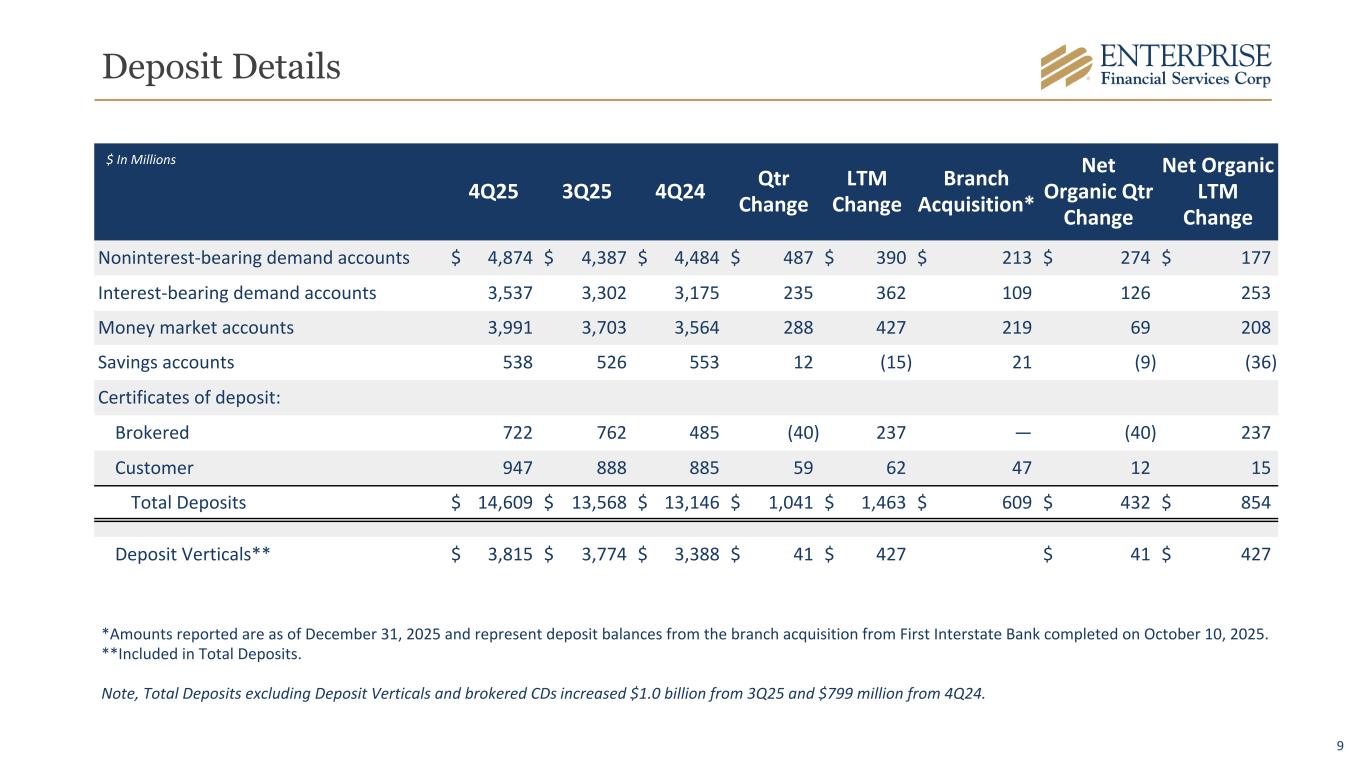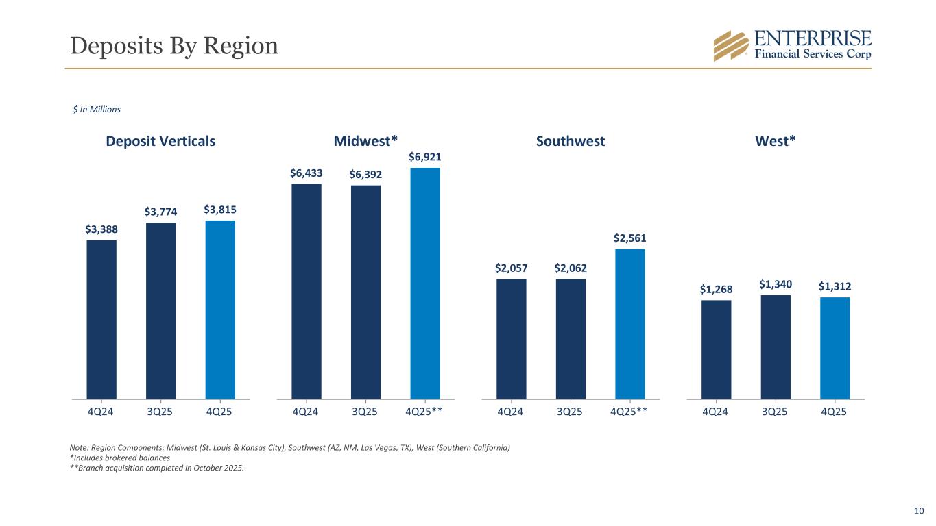9 Deposit Details 4Q25 3Q25 4Q24 Qtr Change LTM Change Branch Acquisition* Net Organic Qtr Change Net Organic LTM Change Noninterest-bearing demand accounts $ 4,874 $ 4,387 $ 4,484 $ 487 $ 390 $ 213 $ 274 $ 177 Interest-bearing demand accounts 3,537 3,302 3,175 235 362 109 126 253 Money market accounts 3,991 3,703 3,564 288 427 219 69 208 Savings accounts 538 526 553 12 (15) 21 (9) (36) Certificates of deposit: Brokered 722 762 485 (40) 237 — (40) 237 Customer 947 888 885 59 62 47 12 15 Total Deposits $ 14,609 $ 13,568 $ 13,146 $ 1,041 $ 1,463 $ 609 $ 432 $ 854 Deposit Verticals** $ 3,815 $ 3,774 $ 3,388 $ 41 $ 427 $ 41 $ 427 $ In Millions *Amounts reported are as of December 31, 2025 and represent deposit balances from the branch acquisition from First Interstate Bank completed on October 10, 2025. **Included in Total Deposits. Note, Total Deposits excluding Deposit Verticals and brokered CDs increased $1.0 billion from 3Q25 and $799 million from 4Q24.