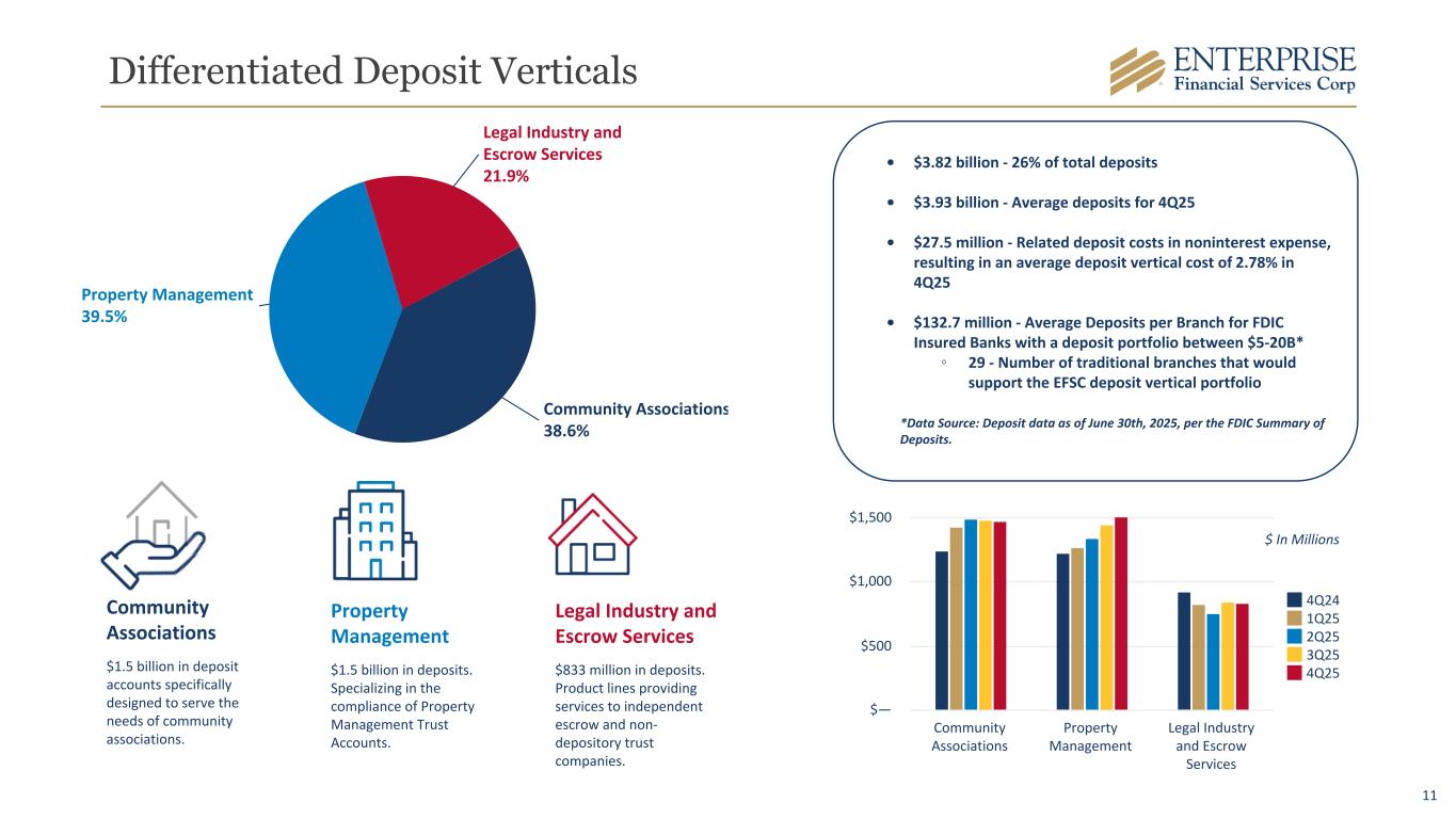 10 Deposits By Region Deposit Verticals $3,388 $3,774 $3,815 4Q24 3Q25 4Q25 $ In Millions Note: Region Components: Midwest (St. Louis & Kansas City), Southwest (AZ, NM, Las Vegas, TX), West (Southern California) *Includes brokered balances **Branch acquisition completed in October 2025. Midwest* $6,433 $6,392 $6,921 4Q24 3Q25 4Q25** West* $1,268 $1,340 $1,312 4Q24 3Q25 4Q25 Southwest $2,057 $2,062 $2,561 4Q24 3Q25 4Q25**