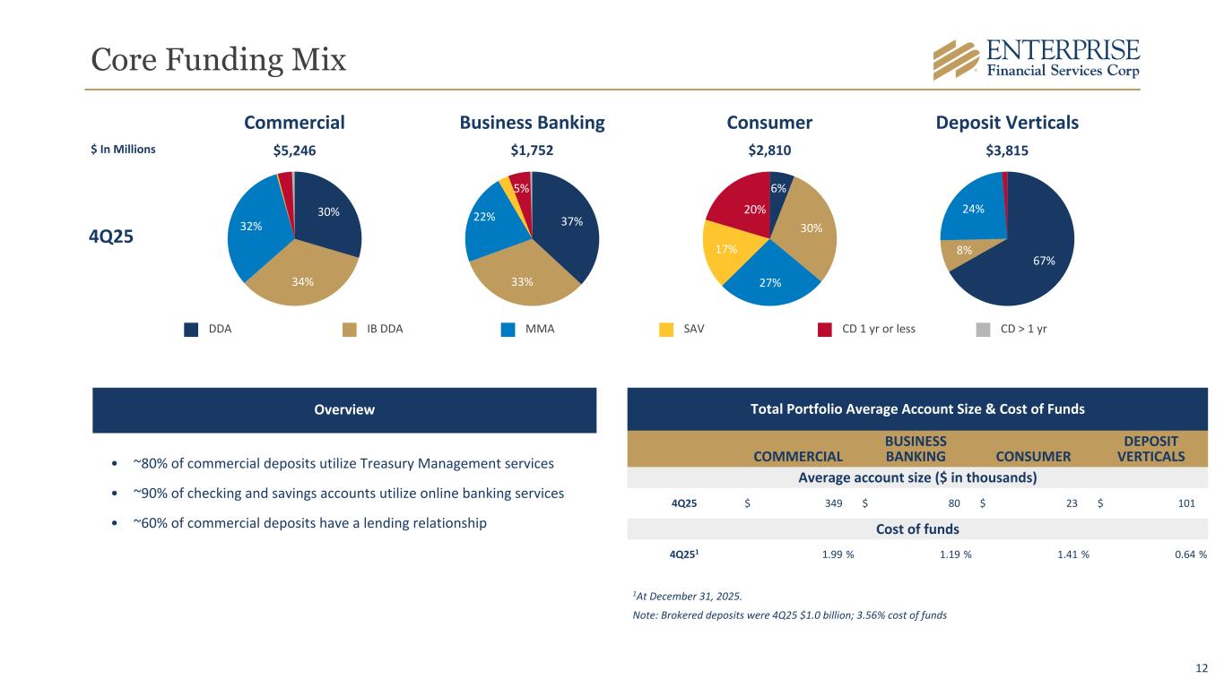 11 Differentiated Deposit Verticals Community Associations 38.6% Property Management 39.5% Legal Industry and Escrow Services 21.9% Community Associations $1.5 billion in deposit accounts specifically designed to serve the needs of community associations. Property Management $1.5 billion in deposits. Specializing in the compliance of Property Management Trust Accounts. Legal Industry and Escrow Services $833 million in deposits. Product lines providing services to independent escrow and non- depository trust companies. • $3.82 billion - 26% of total deposits • $3.93 billion - Average deposits for 4Q25 • $27.5 million - Related deposit costs in noninterest expense, resulting in an average deposit vertical cost of 2.78% in 4Q25 • $132.7 million - Average Deposits per Branch for FDIC Insured Banks with a deposit portfolio between $5-20B* ◦ 29 - Number of traditional branches that would support the EFSC deposit vertical portfolio *Data Source: Deposit data as of June 30th, 2025, per the FDIC Summary of Deposits. 4Q24 1Q25 2Q25 3Q25 4Q25 Community Associations Property Management Legal Industry and Escrow Services $— $500 $1,000 $1,500 $ In Millions