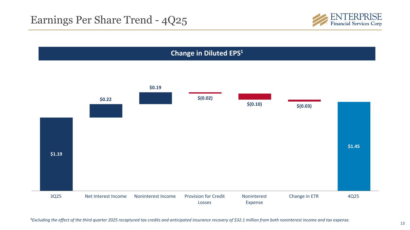 12 Core Funding Mix Commercial Business Banking Consumer $ In Millions 1At December 31, 2025. Note: Brokered deposits were 4Q25 $1.0 billion; 3.56% cost of funds Deposit Verticals Total Portfolio Average Account Size & Cost of Funds COMMERCIAL BUSINESS BANKING CONSUMER DEPOSIT VERTICALS Average account size ($ in thousands) 4Q25 $ 349 $ 80 $ 23 $ 101 Cost of funds 4Q251 1.99 % 1.19 % 1.41 % 0.64 % • ~80% of commercial deposits utilize Treasury Management services • ~90% of checking and savings accounts utilize online banking services • ~60% of commercial deposits have a lending relationship Overview 30% 34% 32% 37% 33% 22% 5% 6% 30% 27% 17% 20% 67% 8% 24% $5,246 $2,810$1,752 DDA IB DDA MMA SAV CD 1 yr or less CD > 1 yr $3,815 4Q25