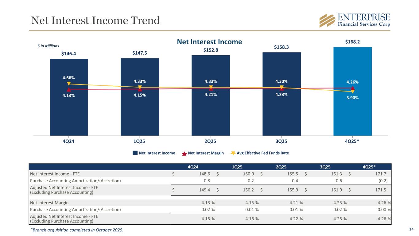 13 Earnings Per Share Trend - 4Q25 $1.19 $0.22 $0.19 $(0.02) $(0.10) $(0.03) $1.45 3Q25 Net Interest Income Noninterest Income Provision for Credit Losses Noninterest Expense Change in ETR 4Q25 Change in Diluted EPS1 1Excluding the effect of the third quarter 2025 recaptured tax credits and anticipated insurance recovery of $32.1 million from both noninterest income and tax expense.