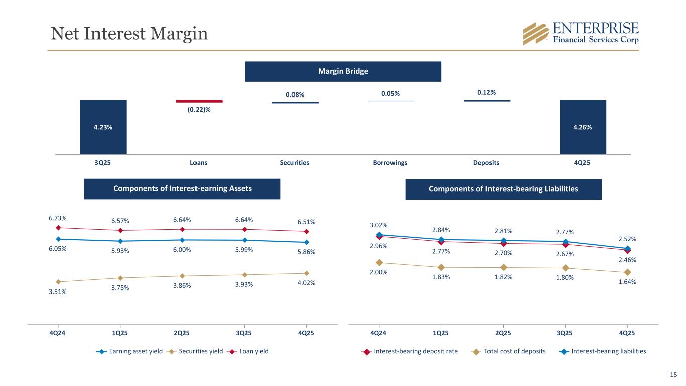 14 $146.4 $147.5 $152.8 $158.3 $168.2 4.13% 4.15% 4.21% 4.23% 4.26% 4.66% 4.33% 4.33% 4.30% 3.90% Net Interest Income Net Interest Margin Avg Effective Fed Funds Rate 4Q24 1Q25 2Q25 3Q25 4Q25* Net Interest Income Trend $ In Millions Net Interest Income 4Q24 1Q25 2Q25 3Q25 4Q25* Net Interest Income - FTE $ 148.6 $ 150.0 $ 155.5 $ 161.3 $ 171.7 Purchase Accounting Amortization/(Accretion) 0.8 0.2 0.4 0.6 (0.2) Adjusted Net Interest Income - FTE (Excluding Purchase Accounting) $ 149.4 $ 150.2 $ 155.9 $ 161.9 $ 171.5 Net Interest Margin 4.13 % 4.15 % 4.21 % 4.23 % 4.26 % Purchase Accounting Amortization/(Accretion) 0.02 % 0.01 % 0.01 % 0.02 % 0.00 % Adjusted Net Interest Income - FTE (Excluding Purchase Accounting) 4.15 % 4.16 % 4.22 % 4.25 % 4.26 % *Branch acquisition completed in October 2025.