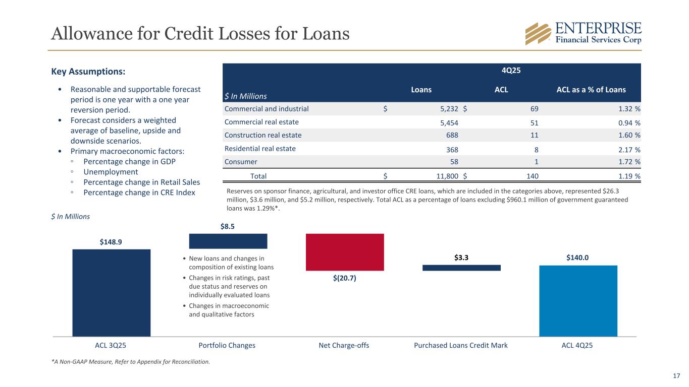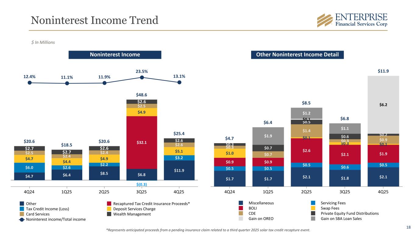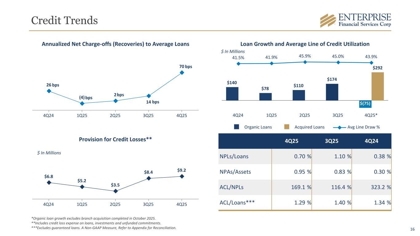 16 26 (4) 2 14 70 4Q24 1Q25 2Q25 3Q25 4Q25 $140 $78 $110 $174 $(75) $292 41.5% 41.9% 45.9% 45.0% 43.9% Organic Loans Acquired Loans Avg Line Draw % 4Q24 1Q25 2Q25 3Q25 4Q25* 4Q25 3Q25 4Q24 NPLs/Loans 0.70 % 1.10 % 0.38 % NPAs/Assets 0.95 % 0.83 % 0.30 % ACL/NPLs 169.1 % 116.4 % 323.2 % ACL/Loans*** 1.29 % 1.40 % 1.34 % Annualized Net Charge-offs (Recoveries) to Average Loans Provision for Credit Losses** $6.8 $5.2 $3.5 $8.4 $9.2 4Q24 1Q25 2Q25 3Q25 4Q25 $ In Millions bps bps bps bps bps $ In Millions Loan Growth and Average Line of Credit Utilization *Organic loan growth excludes branch acquisition completed in October 2025. **Includes credit loss expense on loans, investments and unfunded commitments. ***Excludes guaranteed loans. A Non-GAAP Measure, Refer to Appendix for Reconciliation. Credit Trends