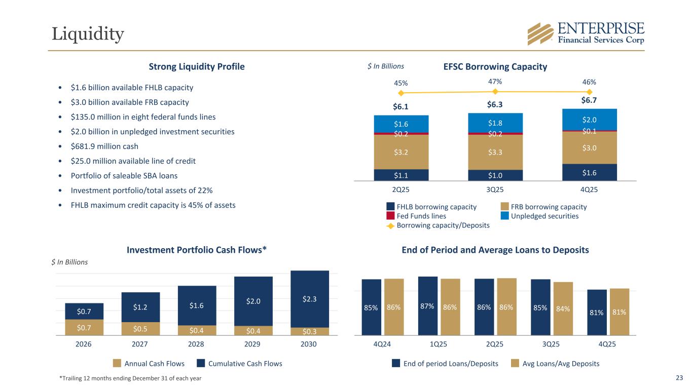 22 Investment Portfolio Breakout AFS & HTM Securities Obligations of U.S. Government- sponsored enterprises 5% Obligations of states and political subdivisions 40% Agency mortgage- backed securities 47% Corporate debt securities 3% U.S. Treasury bills 5% TOTAL $3.7 billion • Effective duration of 5.1 years balances the short 3-year duration of the loan portfolio • Cash flows next 12 months of approximately $660.9 million • 4.02% tax-equivalent yield • Municipal bond portfolio rated A or better • Laddered maturity and repayment structure for consistent cash flows Overview Total AFS (Fair Value) Total HTM (Fair Value) AFS Securities (Net Unrealized Loss) HTM Securities (Net Unrealized Loss) 4Q24 1Q25 2Q25 3Q25 4Q25 $— $1,000 $2,000 $3,000 $(200) $(100) $— $100 $ In Millions $359.4 $314.9 $348.6 $226.6 $575.8 5.10% 5.20% 5.30% 4.99% 4.61% Principal Cost Yield (TEQ) 4Q24 1Q25 2Q25 3Q25 4Q25 Investment Purchase Yield $ In Millions Investment Portfolio