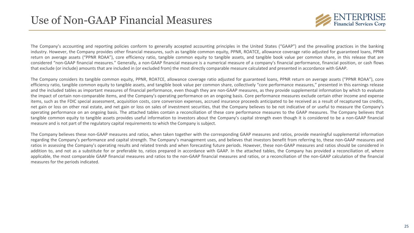 25 Use of Non-GAAP Financial Measures The Company’s accounting and reporting policies conform to generally accepted accounting principles in the United States (“GAAP”) and the prevailing practices in the banking industry. However, the Company provides other financial measures, such as tangible common equity, PPNR, ROATCE, allowance coverage ratio adjusted for guaranteed loans, PPNR return on average assets (“PPNR ROAA”), core efficiency ratio, tangible common equity to tangible assets, and tangible book value per common share, in this release that are considered “non-GAAP financial measures.” Generally, a non-GAAP financial measure is a numerical measure of a company’s financial performance, financial position, or cash flows that exclude (or include) amounts that are included in (or excluded from) the most directly comparable measure calculated and presented in accordance with GAAP. The Company considers its tangible common equity, PPNR, ROATCE, allowance coverage ratio adjusted for guaranteed loans, PPNR return on average assets (“PPNR ROAA”), core efficiency ratio, tangible common equity to tangible assets, and tangible book value per common share, collectively “core performance measures,” presented in this earnings release and the included tables as important measures of financial performance, even though they are non-GAAP measures, as they provide supplemental information by which to evaluate the impact of certain non-comparable items, and the Company’s operating performance on an ongoing basis. Core performance measures exclude certain other income and expense items, such as the FDIC special assessment, acquisition costs, core conversion expenses, accrued insurance proceeds anticipated to be received as a result of recaptured tax credits, net gain or loss on other real estate, and net gain or loss on sales of investment securities, that the Company believes to be not indicative of or useful to measure the Company’s operating performance on an ongoing basis. The attached tables contain a reconciliation of these core performance measures to the GAAP measures. The Company believes that tangible common equity to tangible assets provides useful information to investors about the Company’s capital strength even though it is considered to be a non-GAAP financial measure and is not part of the regulatory capital requirements to which the Company is subject. The Company believes these non-GAAP measures and ratios, when taken together with the corresponding GAAP measures and ratios, provide meaningful supplemental information regarding the Company’s performance and capital strength. The Company’s management uses, and believes that investors benefit from referring to, these non-GAAP measures and ratios in assessing the Company’s operating results and related trends and when forecasting future periods. However, these non-GAAP measures and ratios should be considered in addition to, and not as a substitute for or preferable to, ratios prepared in accordance with GAAP. In the attached tables, the Company has provided a reconciliation of, where applicable, the most comparable GAAP financial measures and ratios to the non-GAAP financial measures and ratios, or a reconciliation of the non-GAAP calculation of the financial measures for the periods indicated.