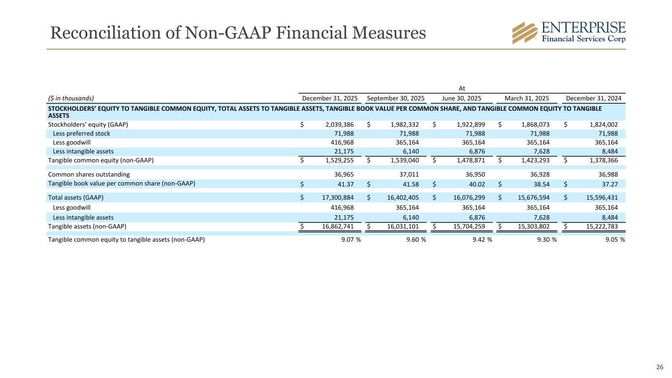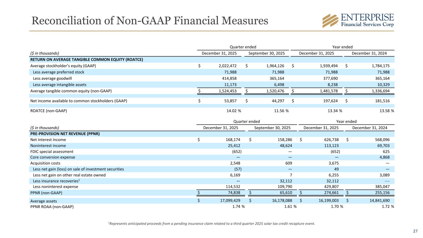 26 Reconciliation of Non-GAAP Financial Measures At ($ in thousands) December 31, 2025 September 30, 2025 June 30, 2025 March 31, 2025 December 31, 2024 STOCKHOLDERS’ EQUITY TO TANGIBLE COMMON EQUITY, TOTAL ASSETS TO TANGIBLE ASSETS, TANGIBLE BOOK VALUE PER COMMON SHARE, AND TANGIBLE COMMON EQUITY TO TANGIBLE ASSETS Stockholders’ equity (GAAP) $ 2,039,386 $ 1,982,332 $ 1,922,899 $ 1,868,073 $ 1,824,002 Less preferred stock 71,988 71,988 71,988 71,988 71,988 Less goodwill 416,968 365,164 365,164 365,164 365,164 Less intangible assets 21,175 6,140 6,876 7,628 8,484 Tangible common equity (non-GAAP) $ 1,529,255 $ 1,539,040 $ 1,478,871 $ 1,423,293 $ 1,378,366 Common shares outstanding 36,965 37,011 36,950 36,928 36,988 Tangible book value per common share (non-GAAP) $ 41.37 $ 41.58 $ 40.02 $ 38.54 $ 37.27 Total assets (GAAP) $ 17,300,884 $ 16,402,405 $ 16,076,299 $ 15,676,594 $ 15,596,431 Less goodwill 416,968 365,164 365,164 365,164 365,164 Less intangible assets 21,175 6,140 6,876 7,628 8,484 Tangible assets (non-GAAP) $ 16,862,741 $ 16,031,101 $ 15,704,259 $ 15,303,802 $ 15,222,783 Tangible common equity to tangible assets (non-GAAP) 9.07 % 9.60 % 9.42 % 9.30 % 9.05 %