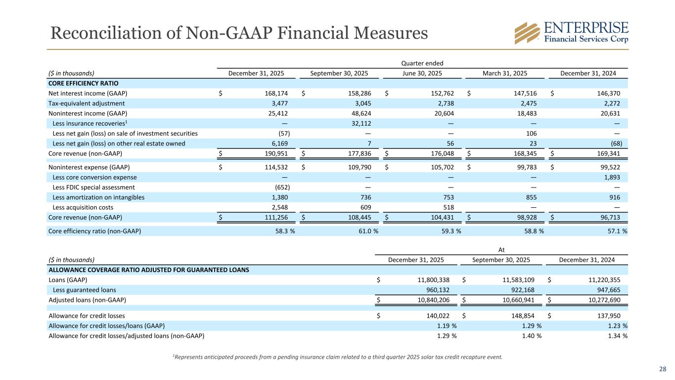 28 Reconciliation of Non-GAAP Financial Measures 1Represents anticipated proceeds from a pending insurance claim related to a third quarter 2025 solar tax credit recapture event. At ($ in thousands) December 31, 2025 September 30, 2025 December 31, 2024 ALLOWANCE COVERAGE RATIO ADJUSTED FOR GUARANTEED LOANS Loans (GAAP) $ 11,800,338 $ 11,583,109 $ 11,220,355 Less guaranteed loans 960,132 922,168 947,665 Adjusted loans (non-GAAP) $ 10,840,206 $ 10,660,941 $ 10,272,690 Allowance for credit losses $ 140,022 $ 148,854 $ 137,950 Allowance for credit losses/loans (GAAP) 1.19 % 1.29 % 1.23 % Allowance for credit losses/adjusted loans (non-GAAP) 1.29 % 1.40 % 1.34 % Quarter ended ($ in thousands) December 31, 2025 September 30, 2025 June 30, 2025 March 31, 2025 December 31, 2024 CORE EFFICIENCY RATIO Net interest income (GAAP) $ 168,174 $ 158,286 $ 152,762 $ 147,516 $ 146,370 Tax-equivalent adjustment 3,477 3,045 2,738 2,475 2,272 Noninterest income (GAAP) 25,412 48,624 20,604 18,483 20,631 Less insurance recoveries1 — 32,112 — — — Less net gain (loss) on sale of investment securities (57) — — 106 — Less net gain (loss) on other real estate owned 6,169 7 56 23 (68) Core revenue (non-GAAP) $ 190,951 $ 177,836 $ 176,048 $ 168,345 $ 169,341 Noninterest expense (GAAP) $ 114,532 $ 109,790 $ 105,702 $ 99,783 $ 99,522 Less core conversion expense — — — — 1,893 Less FDIC special assessment (652) — — — — Less amortization on intangibles 1,380 736 753 855 916 Less acquisition costs 2,548 609 518 — — Core revenue (non-GAAP) $ 111,256 $ 108,445 $ 104,431 $ 98,928 $ 96,713 Core efficiency ratio (non-GAAP) 58.3 % 61.0 % 59.3 % 58.8 % 57.1 %