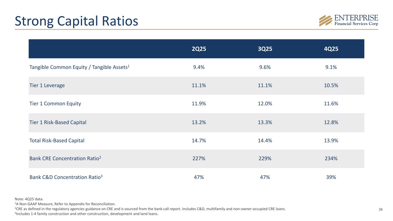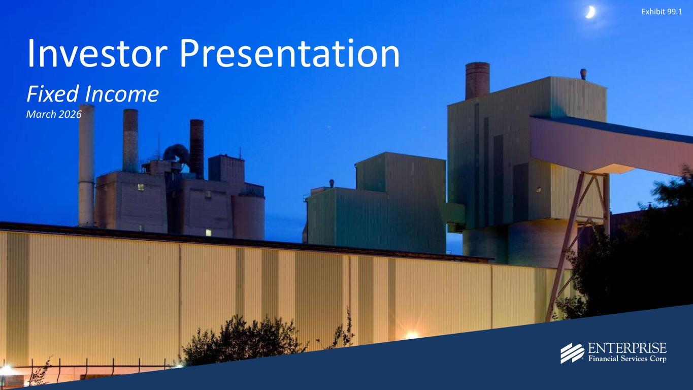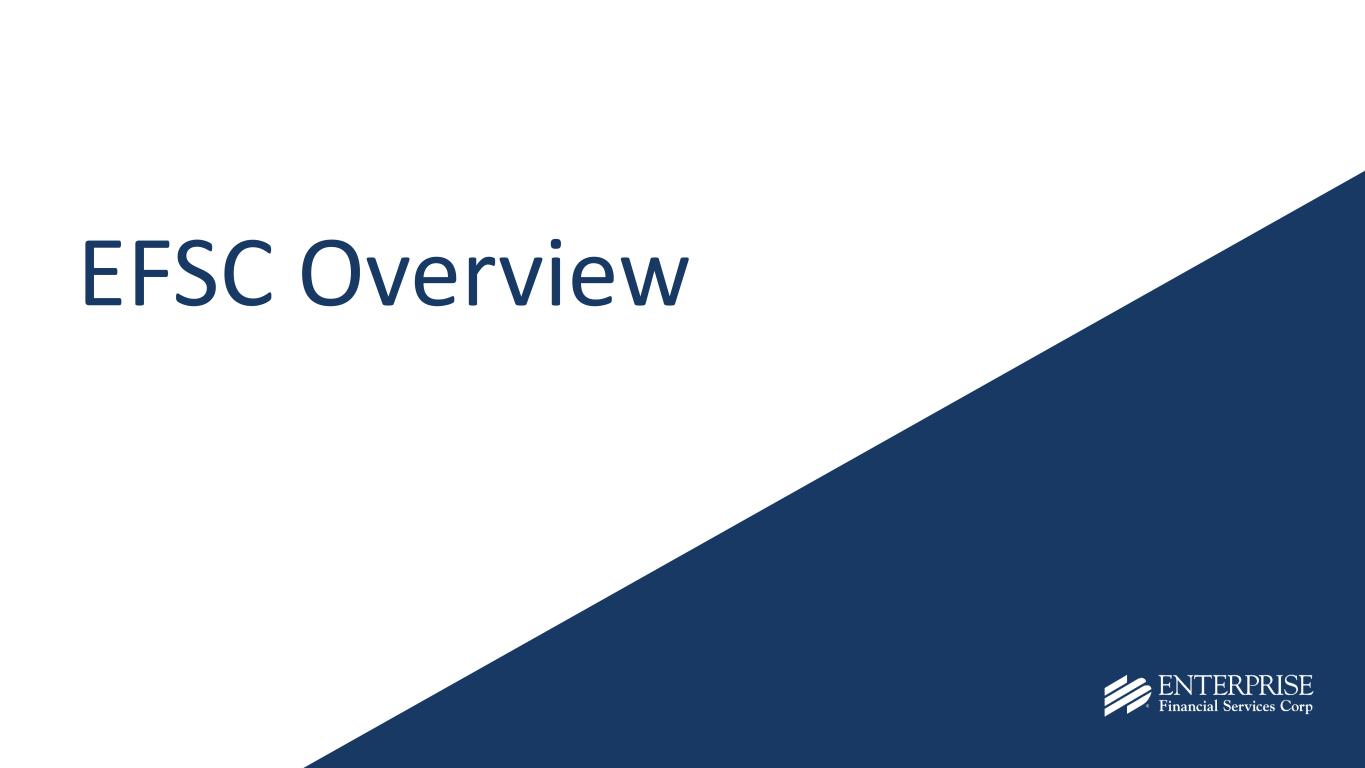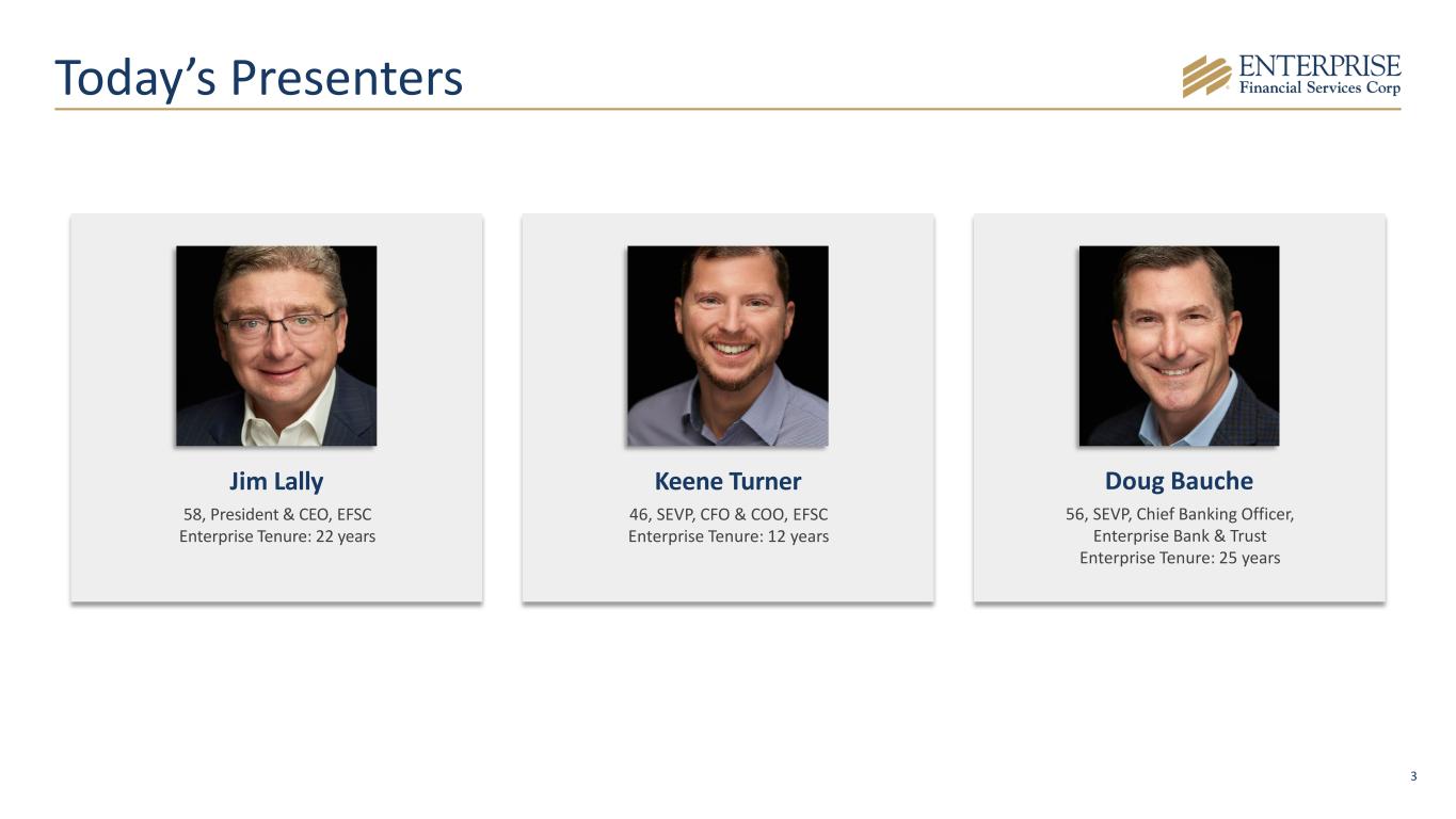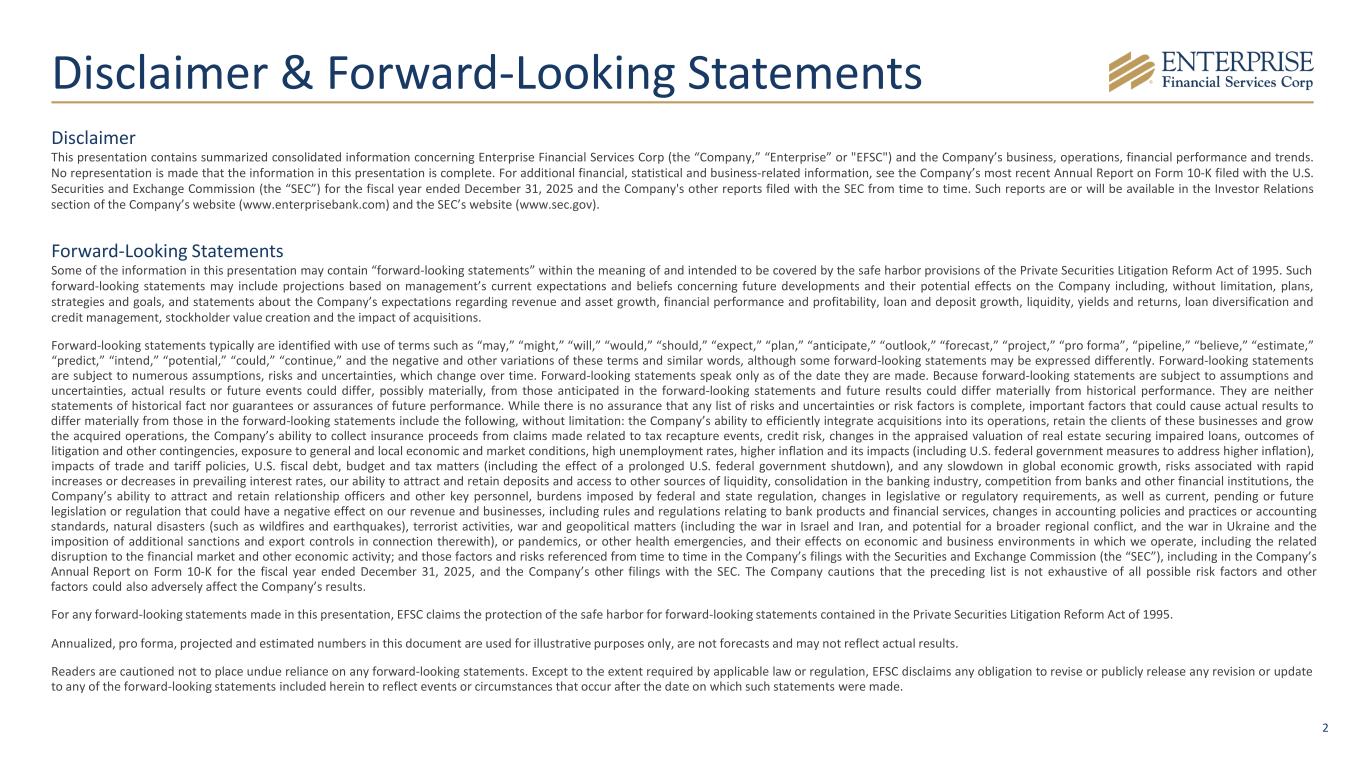 2 Disclaimer & Forward-Looking Statements Disclaimer This presentation contains summarized consolidated information concerning Enterprise Financial Services Corp (the “Company,” “Enterprise” or "EFSC") and the Company’s business, operations, financial performance and trends. No representation is made that the information in this presentation is complete. For additional financial, statistical and business-related information, see the Company’s most recent Annual Report on Form 10-K filed with the U.S. Securities and Exchange Commission (the “SEC”) for the fiscal year ended December 31, 2025 and the Company's other reports filed with the SEC from time to time. Such reports are or will be available in the Investor Relations section of the Company’s website (www.enterprisebank.com) and the SEC’s website (www.sec.gov). Forward-Looking Statements Some of the information in this presentation may contain “forward-looking statements” within the meaning of and intended to be covered by the safe harbor provisions of the Private Securities Litigation Reform Act of 1995. Such forward-looking statements may include projections based on management’s current expectations and beliefs concerning future developments and their potential effects on the Company including, without limitation, plans, strategies and goals, and statements about the Company’s expectations regarding revenue and asset growth, financial performance and profitability, loan and deposit growth, liquidity, yields and returns, loan diversification and credit management, stockholder value creation and the impact of acquisitions. Forward-looking statements typically are identified with use of terms such as “may,” “might,” “will,” “would,” “should,” “expect,” “plan,” “anticipate,” “outlook,” “forecast,” “project,” “pro forma”, “pipeline,” “believe,” “estimate,” “predict,” “intend,” “potential,” “could,” “continue,” and the negative and other variations of these terms and similar words, although some forward-looking statements may be expressed differently. Forward-looking statements are subject to numerous assumptions, risks and uncertainties, which change over time. Forward-looking statements speak only as of the date they are made. Because forward-looking statements are subject to assumptions and uncertainties, actual results or future events could differ, possibly materially, from those anticipated in the forward-looking statements and future results could differ materially from historical performance. They are neither statements of historical fact nor guarantees or assurances of future performance. While there is no assurance that any list of risks and uncertainties or risk factors is complete, important factors that could cause actual results to differ materially from those in the forward-looking statements include the following, without limitation: the Company’s ability to efficiently integrate acquisitions into its operations, retain the clients of these businesses and grow the acquired operations, the Company’s ability to collect insurance proceeds from claims made related to tax recapture events, credit risk, changes in the appraised valuation of real estate securing impaired loans, outcomes of litigation and other contingencies, exposure to general and local economic and market conditions, high unemployment rates, higher inflation and its impacts (including U.S. federal government measures to address higher inflation), impacts of trade and tariff policies, U.S. fiscal debt, budget and tax matters (including the effect of a prolonged U.S. federal government shutdown), and any slowdown in global economic growth, risks associated with rapid increases or decreases in prevailing interest rates, our ability to attract and retain deposits and access to other sources of liquidity, consolidation in the banking industry, competition from banks and other financial institutions, the Company’s ability to attract and retain relationship officers and other key personnel, burdens imposed by federal and state regulation, changes in legislative or regulatory requirements, as well as current, pending or future legislation or regulation that could have a negative effect on our revenue and businesses, including rules and regulations relating to bank products and financial services, changes in accounting policies and practices or accounting standards, natural disasters (such as wildfires and earthquakes), terrorist activities, war and geopolitical matters (including the war in Israel and Iran, and potential for a broader regional conflict, and the war in Ukraine and the imposition of additional sanctions and export controls in connection therewith), or pandemics, or other health emergencies, and their effects on economic and business environments in which we operate, including the related disruption to the financial market and other economic activity; and those factors and risks referenced from time to time in the Company’s filings with the Securities and Exchange Commission (the “SEC”), including in the Company’s Annual Report on Form 10-K for the fiscal year ended December 31, 2025, and the Company’s other filings with the SEC. The Company cautions that the preceding list is not exhaustive of all possible risk factors and other factors could also adversely affect the Company’s results. For any forward-looking statements made in this presentation, EFSC claims the protection of the safe harbor for forward-looking statements contained in the Private Securities Litigation Reform Act of 1995. Annualized, pro forma, projected and estimated numbers in this document are used for illustrative purposes only, are not forecasts and may not reflect actual results. Readers are cautioned not to place undue reliance on any forward-looking statements. Except to the extent required by applicable law or regulation, EFSC disclaims any obligation to
