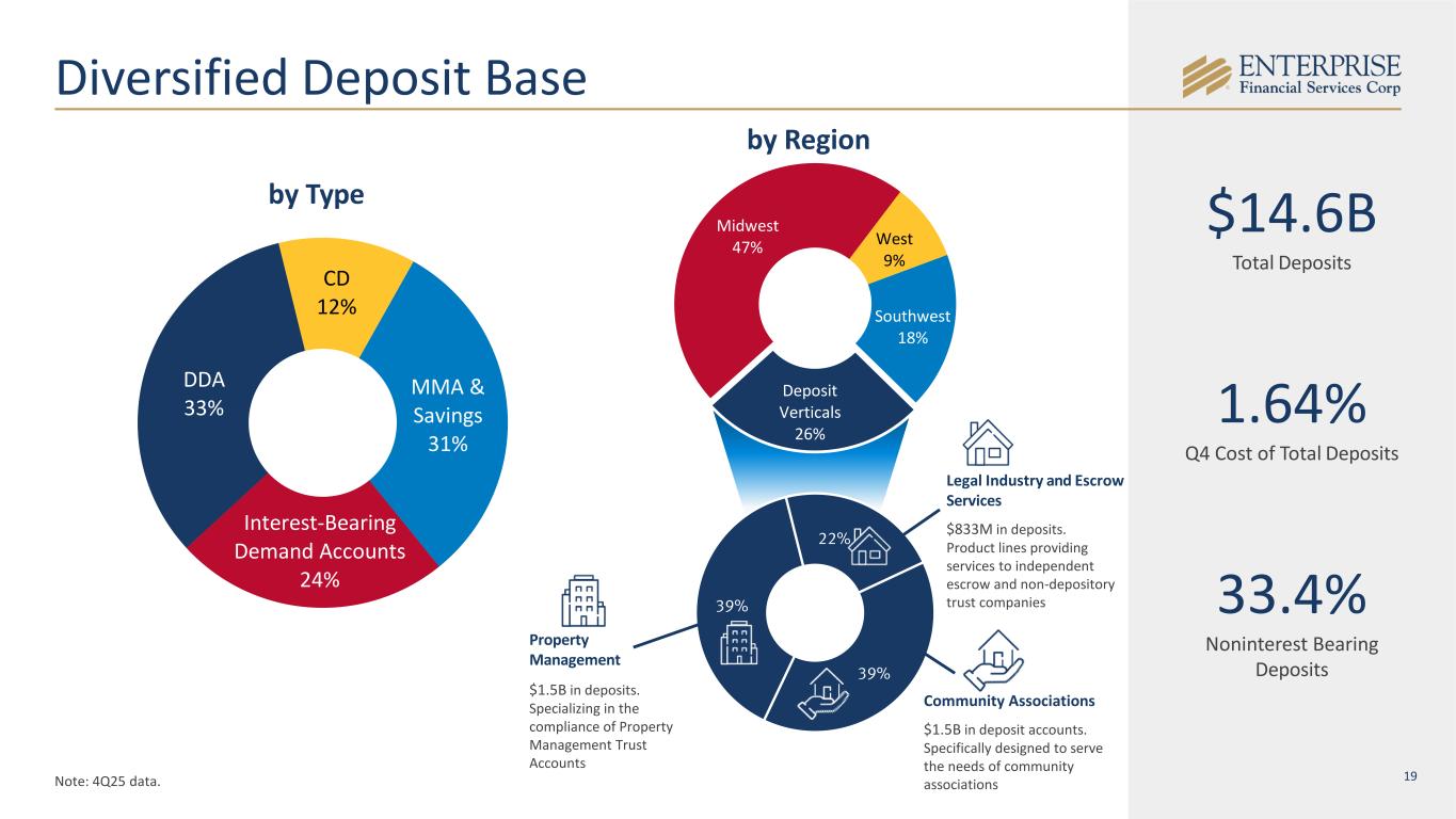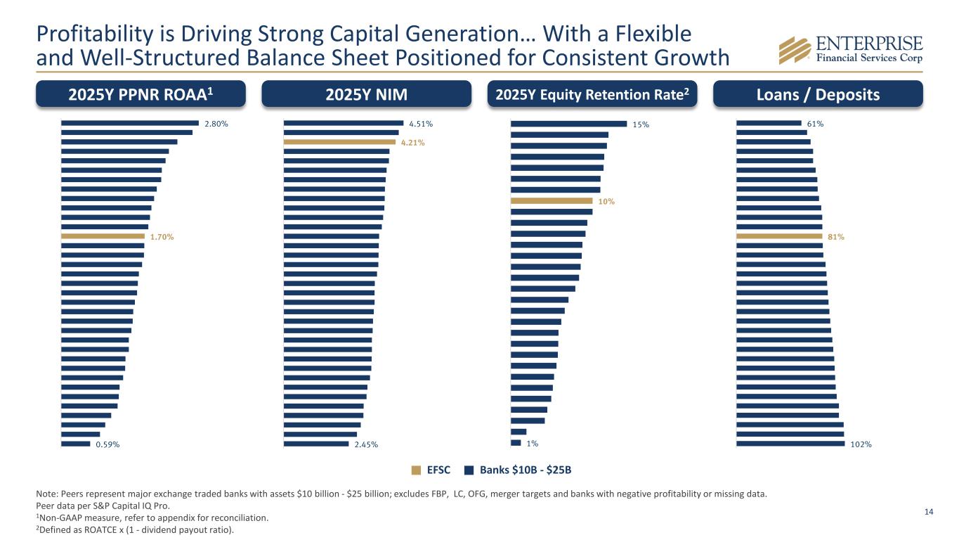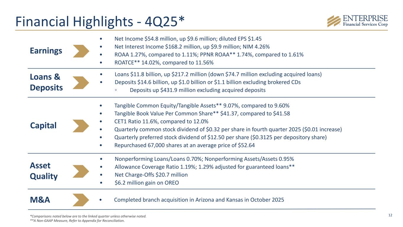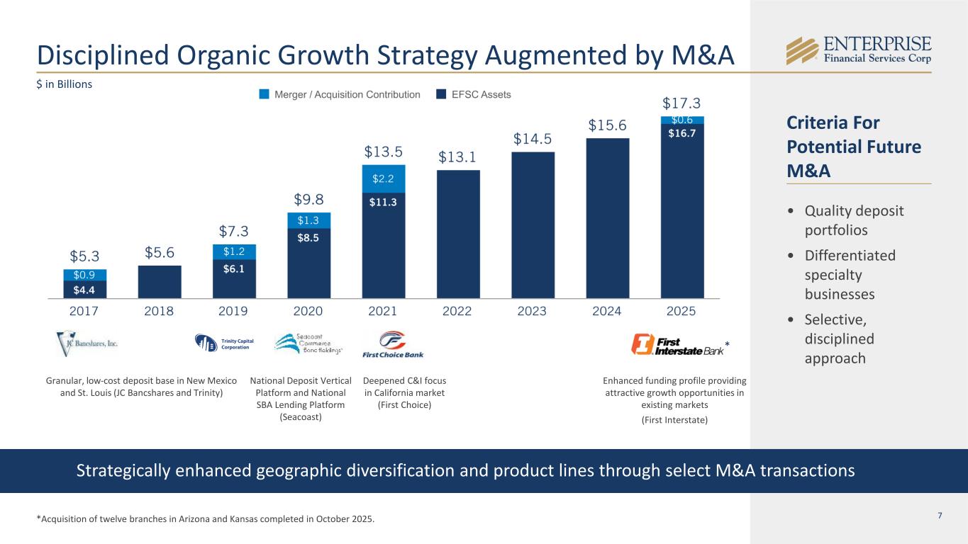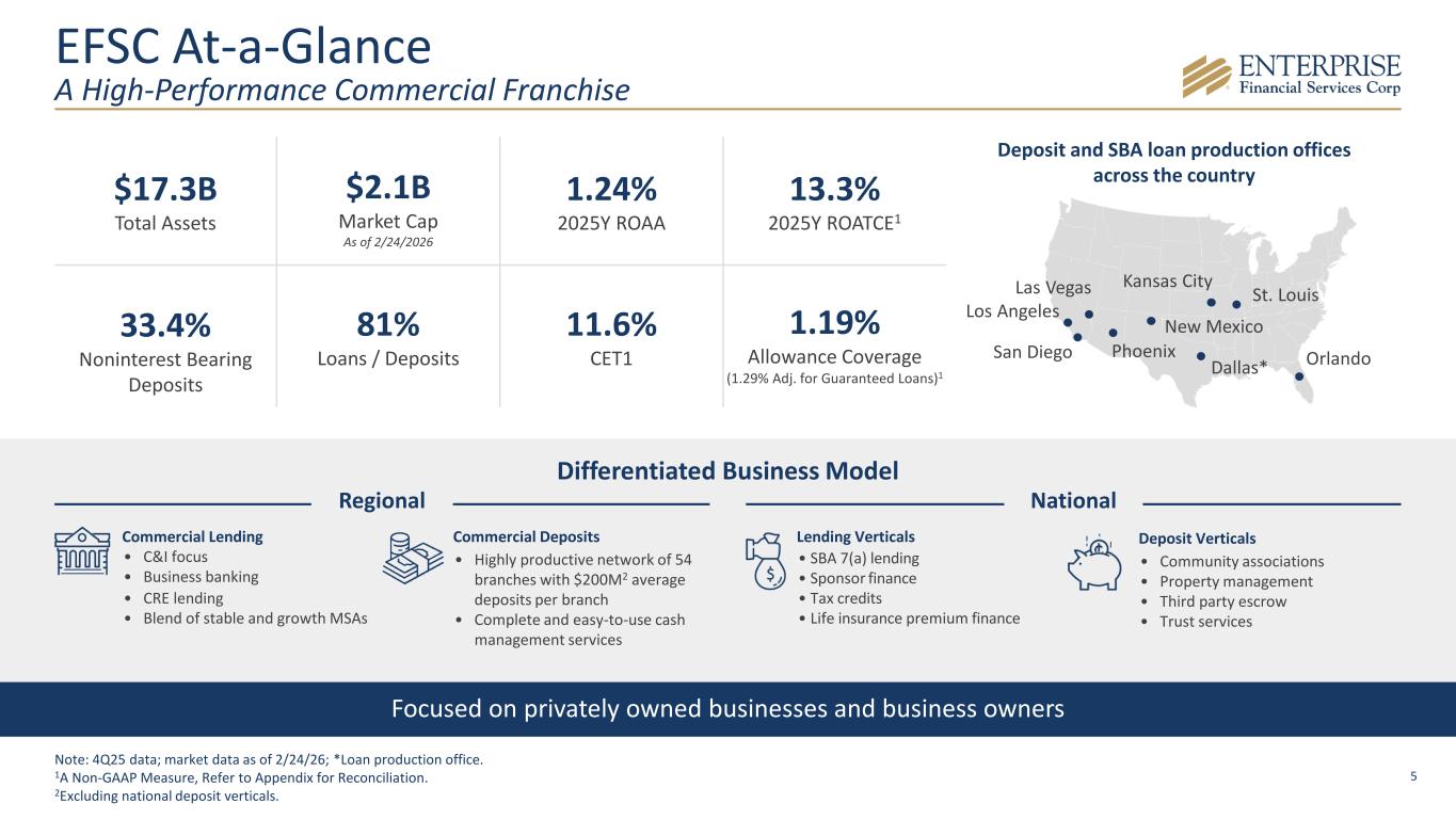 2 Disclaimer & Forward-Looking Statements Disclaimer This presentation contains summarized consolidated information concerning Enterprise Financial Services Corp (the “Company,” “Enterprise” or "EFSC") and the Company’s business, operations, financial performance and trends. No representation is made that the information in this presentation is complete. For additional financial, statistical and business-related information, see the Company’s most recent Annual Report on Form 10-K filed with the U.S. Securities and Exchange Commission (the “SEC”) for the fiscal year ended December 31, 2025 and the Company's other reports filed with the SEC from time to time. Such reports are or will be available in the Investor Relations section of the Company’s website (www.enterprisebank.com) and the SEC’s website (www.sec.gov). Forward-Looking Statements Some of the information in this presentation may contain “forward-looking statements” within the meaning of and intended to be covered by the safe harbor provisions of the Private Securities Litigation Reform Act of 1995. Such forward-looking statements may include projections based on management’s current expectations and beliefs concerning future developments and their potential effects on the Company including, without limitation, plans, strategies and goals, and statements about the Company’s expectations regarding revenue and asset growth, financial performance and profitability, loan and deposit growth, liquidity, yields and returns, loan diversification and credit management, stockholder value creation and the impact of acquisitions. Forward-looking statements typically are identified with use of terms such as “may,” “might,” “will,” “would,” “should,” “expect,” “plan,” “anticipate,” “outlook,” “forecast,” “project,” “pro forma”, “pipeline,” “believe,” “estimate,” “predict,” “intend,” “potential,” “could,” “continue,” and the negative and other variations of these terms and similar words, although some forward-looking statements may be expressed differently. Forward-looking statements are subject to numerous assumptions, risks and uncertainties, which change over time. Forward-looking statements speak only as of the date they are made. Because forward-looking statements are subject to assumptions and uncertainties, actual results or future events could differ, possibly materially, from those anticipated in the forward-looking statements and future results could differ materially from historical performance. They are neither statements of historical fact nor guarantees or assurances of future performance. While there is no assurance that any list of risks and uncertainties or risk factors is complete, important factors that could cause actual results to differ materially from those in the forward-looking statements include the following, without limitation: the Company’s ability to efficiently integrate acquisitions into its operations, retain the clients of these businesses and grow the acquired operations, the Company’s ability to collect insurance proceeds from claims made related to tax recapture events, credit risk, changes in the appraised valuation of real estate securing impaired loans, outcomes of litigation and other contingencies, exposure to general and local economic and market conditions, high unemployment rates, higher inflation and its impacts (including U.S. federal government measures to address higher inflation), impacts of trade and tariff policies, U.S. fiscal debt, budget and tax matters (including the effect of a prolonged U.S. federal government shutdown), and any slowdown in global economic growth, risks associated with rapid increases or decreases in prevailing interest rates, our ability to attract and retain deposits and access to other sources of liquidity, consolidation in the banking industry, competition from banks and other financial institutions, the Company’s ability to attract and retain relationship officers and other key personnel, burdens imposed by federal and state regulation, changes in legislative or regulatory requirements, as well as current, pending or future legislation or regulation that could have a negative effect on our revenue and businesses, including rules and regulations relating to bank products and financial services, changes in accounting policies and practices or accounting standards, natural disasters (such as wildfires and earthquakes), terrorist activities, war and geopolitical matters (including the war in Israel and Iran, and potential for a broader regional conflict, and the war in Ukraine and the imposition of additional sanctions and export controls in connection therewith), or pandemics, or other health emergencies, and their effects on economic and business environments in which we operate, including the related disruption to the financial market and other economic activity; and those factors and risks referenced from time to time in the Company’s filings with the Securities and Exchange Commission (the “SEC”), including in the Company’s Annual Report on Form 10-K for the fiscal year ended December 31, 2025, and the Company’s other filings with the SEC. The Company cautions that the preceding list is not exhaustive of all possible risk factors and other factors could also adversely affect the Company’s results. For any forward-looking statements made in this presentation, EFSC claims the protection of the safe harbor for forward-looking statements contained in the Private Securities Litigation Reform Act of 1995. Annualized, pro forma, projected and estimated numbers in this document are used for illustrative purposes only, are not forecasts and may not reflect actual results. Readers are cautioned not to place undue reliance on any forward-looking statements. Except to the extent required by applicable law or regulation, EFSC disclaims any obligation to