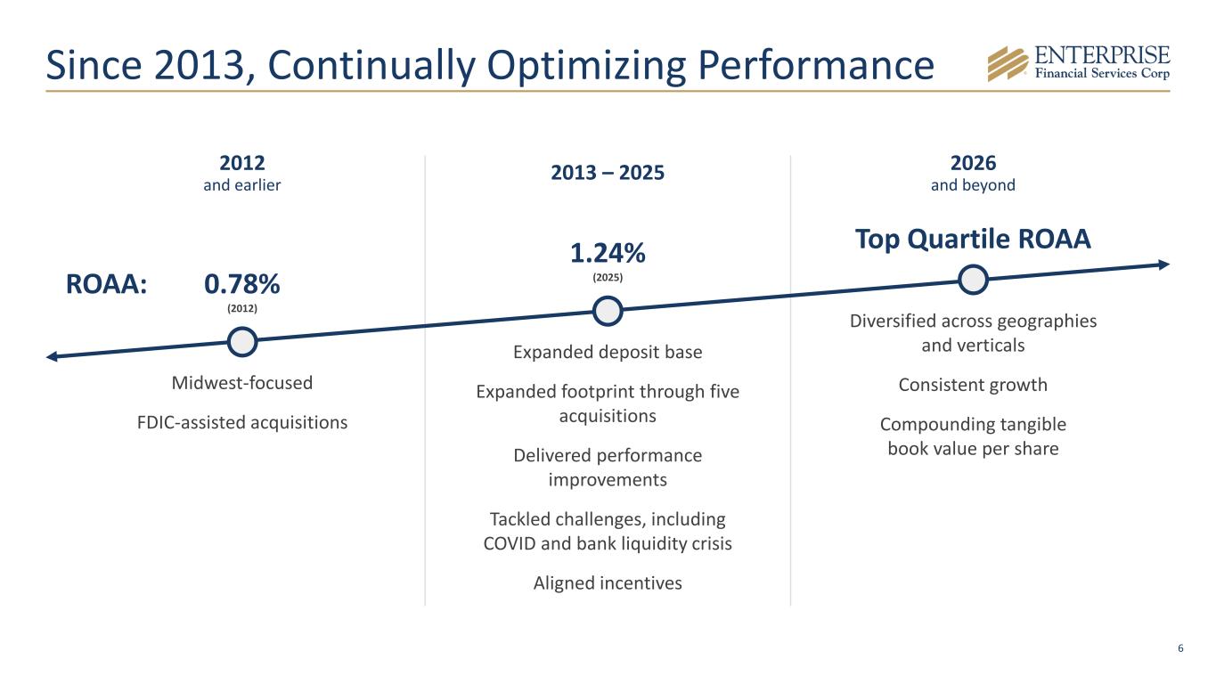 5 Differentiated Business Model Focused on privately owned businesses and business owners Commercial Deposits • Highly productive network of 54 branches with $200M2 average deposits per branch • Complete and easy-to-use cash management services Deposit Verticals • Community associations • Property management • Third party escrow • Trust services Deposit and SBA loan production offices across the country Commercial Lending • C&I focus • Business banking • CRE lending • Blend of stable and growth MSAs Lending Verticals • SBA 7(a) lending • Sponsor finance • Tax credits • Life insurance premium finance $17.3B Total Assets $2.1B Market Cap As of 2/24/2026 1.24% 2025Y ROAA 13.3% 2025Y ROATCE1 33.4% Noninterest Bearing Deposits 81% Loans / Deposits 11.6% CET1 1.19% Allowance Coverage (1.29% Adj. for Guaranteed Loans)1 Note: 4Q25 data; market data as of 2/24/26; *Loan production office. 1A Non-GAAP Measure, Refer to Appendix for Reconciliation. 2Excluding national deposit verticals. St. Louis Kansas City Phoenix New Mexico Los Angeles Las Vegas San Diego Dallas* Orlando EFSC At-a-Glance A High-Performance Commercial Franchise Regional National