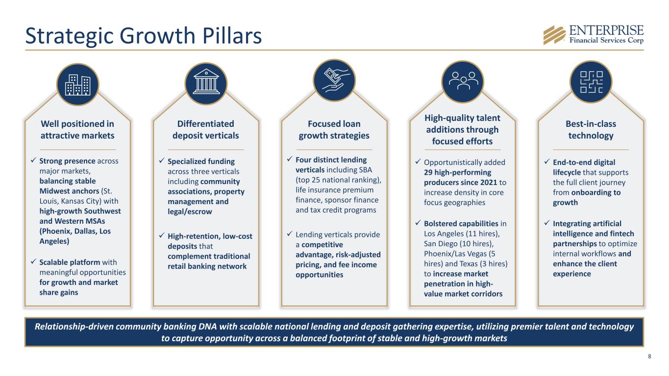 7 Strategically enhanced geographic diversification and product lines through select M&A transactions $ in Billions Granular, low-cost deposit base in New Mexico and St. Louis (JC Bancshares and Trinity) National Deposit Vertical Platform and National SBA Lending Platform (Seacoast) Deepened C&I focus in California market (First Choice) Disciplined Organic Growth Strategy Augmented by M&A Criteria For Potential Future M&A • Quality deposit portfolios • Differentiated specialty businesses • Selective, disciplined approach Enhanced funding profile providing attractive growth opportunities in existing markets (First Interstate) * *Acquisition of twelve branches in Arizona and Kansas completed in October 2025.
